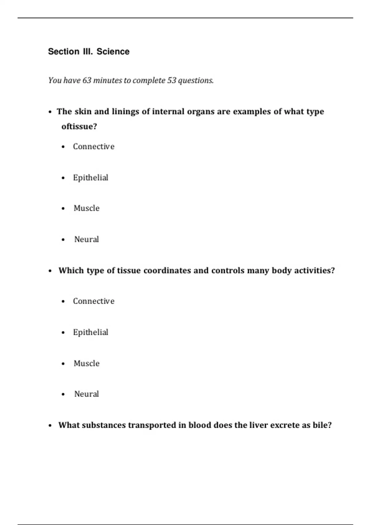 Section III. Science You have 63 minutes to complete 53 questions. The skin and linings of internal organs are examples of what type of tissue? Connective Epithelial Muscle Neural Which type of tissue coordinates and controls many body activities? Connective Epithelial Muscle Neural What substances transported in blood does the liver excrete as bile? Gases Hormones Nutrients Copyright © 2019. Smart Edition Media. All rights reserved. Wastes What is the purpose of the superior vena cava? Flow blood into the pulmonary artery Facilitate blood drainage into the right ventricle Receive deoxygenated blood from systemic circulation Saturate the body tissues with a large volume of blood