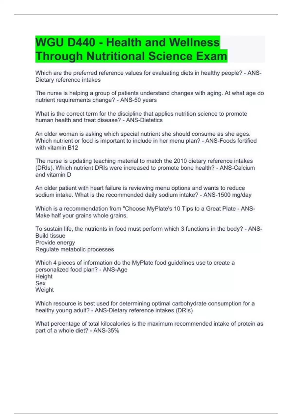 WGU D440 - Health and Wellness Through Nutritional Science Exam