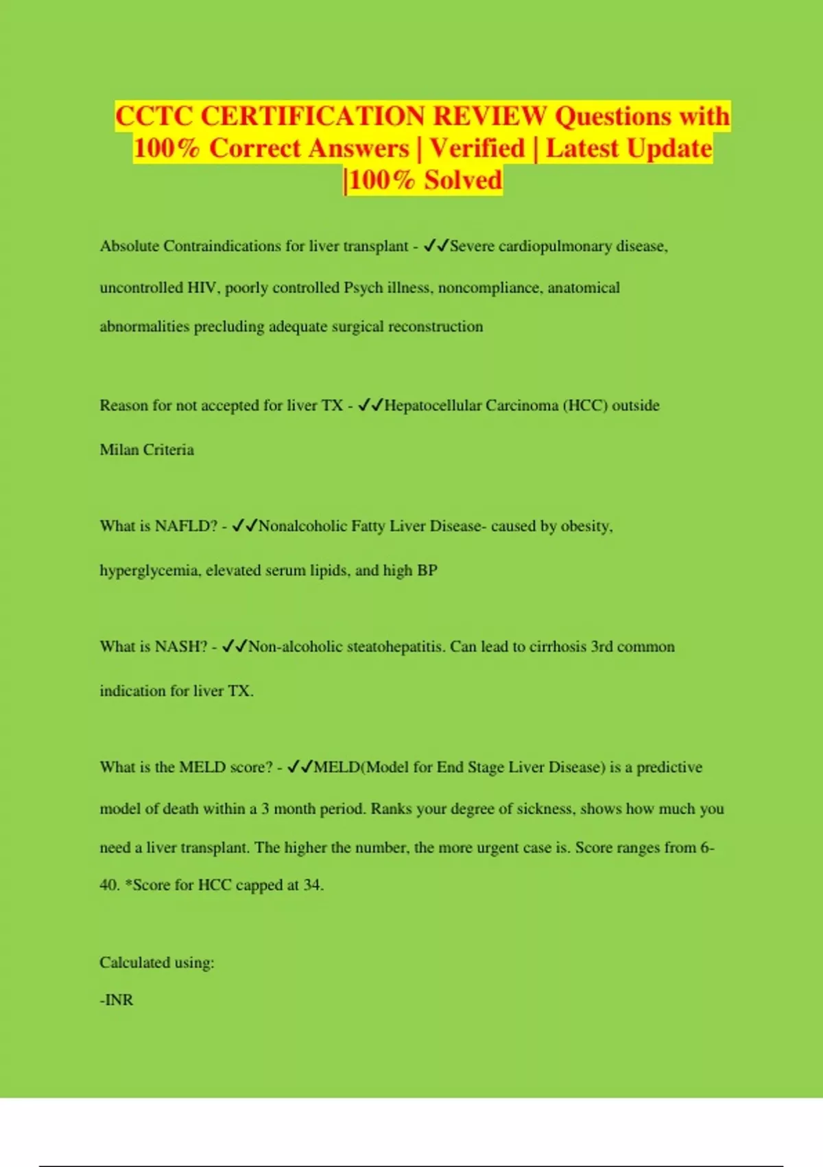 CCTC CERTIFICATION REVIEW Questions with 100% Correct Answers | Verified | Latest Update |100% Solved Absolute Contraindications for liver transplant - Severe cardiopulmonary disease, uncontrolled HIV, poorly controlled Psych illness, noncompliance, anatomical abnormalities precluding adequate surgical reconstruction Reason for not accepted for liver TX - Hepatocellular Carcinoma (HCC) outside Milan Criteria What is NAFLD? - Nonalcoholic Fatty Liver Disease- caused by obesity, hyperglycemia, elevated serum lipids, and high BP What is NASH? - Non-alcoholic steatohepatitis. Can lead to cirrhosis 3rd common indication for liver TX. What is the MELD score? - MELD(Model for End Stage Liver Disease) is a predictive model of death within a 3 month period. Ranks your degree of sickness, shows how much you need a liver transplant. The higher the number, the more urgent case is. Score ranges from 6- 40. *Score for HCC capped at 34. Calculated using: