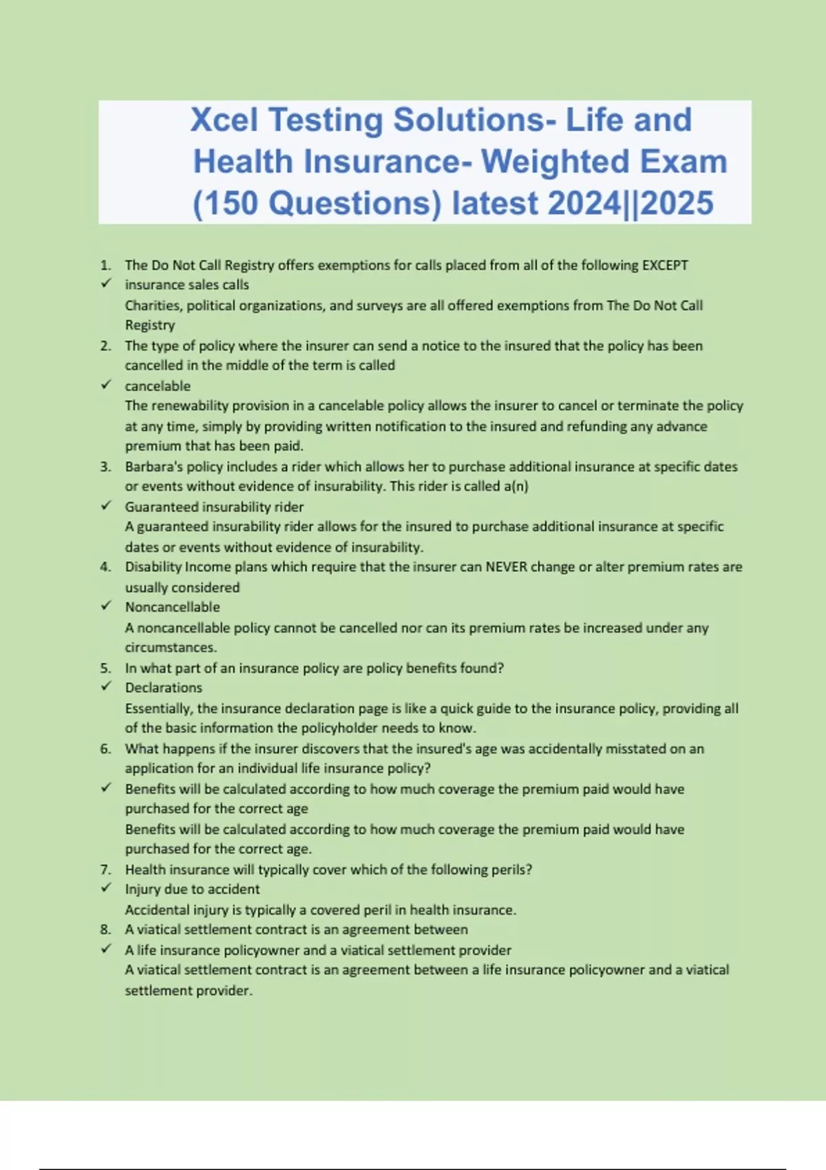 Xcel Testing Solutions- Life and Health Insurance- Weighted Exam (150 Questions) latest 2024