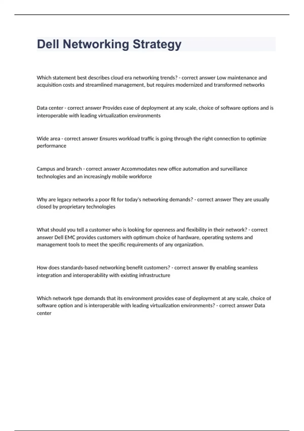 Dell Networking Strategy Question and answers 100% correct 2024 Which statement best describes cloud era networking trends? - correct answer Low maintenance and acquisition costs and streamlined management, but requires modernized and transformed networks Data center - correct answer Provides ease of deployment at any scale, choice of software options and is interoperable with leading virtualization environments Wide area - correct answer Ensures workload traffic is going through the right connection to optimize performance Campus and branch - correct answer Accommodates new office automation and surveillance technologies and an increasingly mobile workforce Why are legacy networks a poor fit for today's networking demands? - correct answer They are usually closed by proprietary technologies What should you tell a customer who is looking for openness and flexibility in their network? - correct answer Dell EMC provides customers with optimum choice of hardware, operating systems and management tools to meet the specific requirements of any organization. How does standards-based networking benefit customers? - correct answer By enabling seamless integration and interoperability with existing infrastructure Which network type demands that its environment provides ease of deployment at any scale, choice of software option and is interoperable with leading virtualization environments? - correct answer Data center