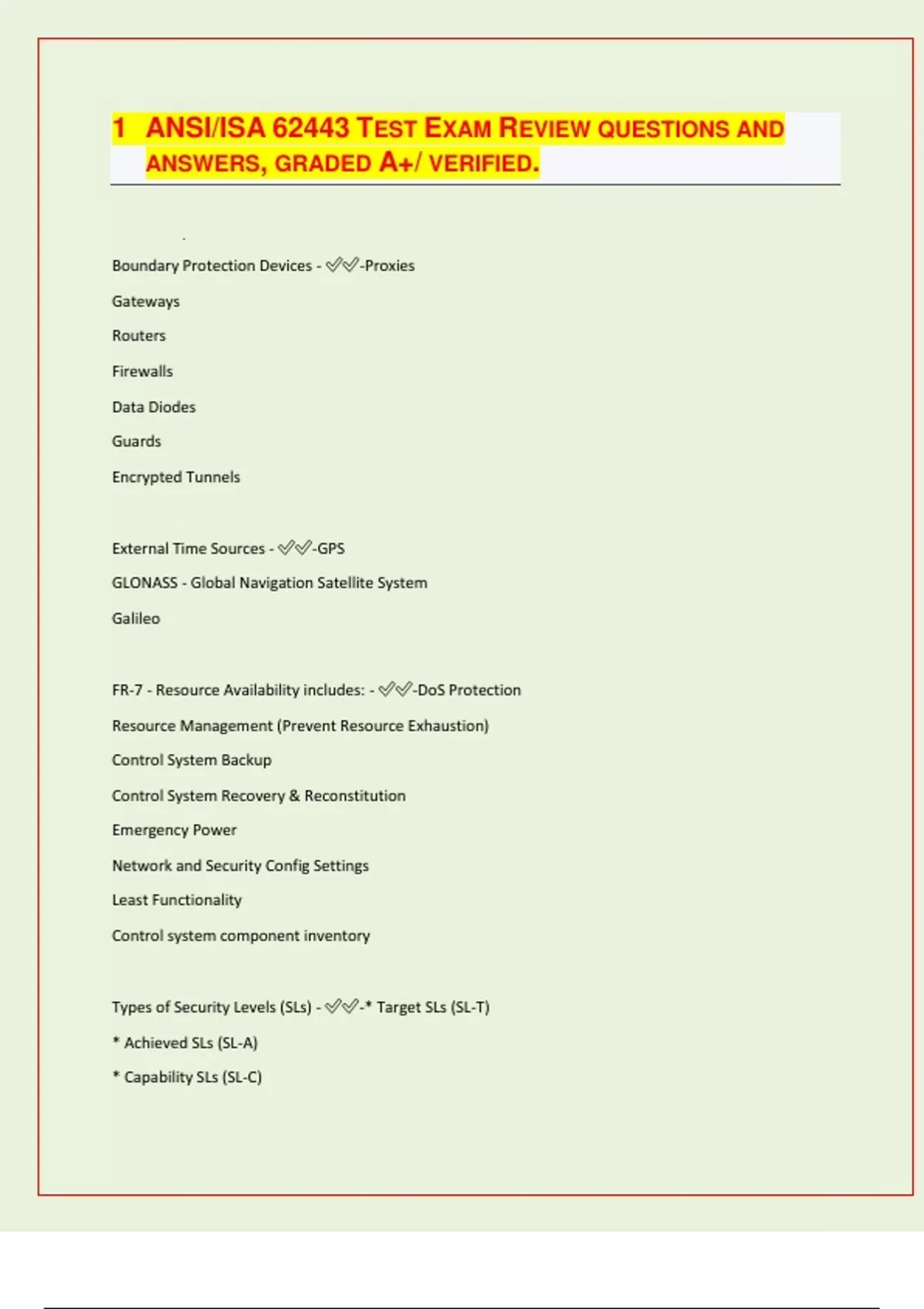 ANSI/ISA 62443 TEST EXAM REVIEW QUESTIONS AND ANSWERS, GRADED A+/ VERIFIED. Boundary Protection Devices - -Proxies Gateways Routers Firewalls Data Diodes Guards Encrypted Tunnels External Time Sources - -GPS GLONASS - Global Navigation Satellite System Galileo FR-7 - Resource Availability includes: - -DoS Protection Resource Management (Prevent Resource Exhaustion) Control System Backup Control System Recovery & Reconstitution Emergency Power Network and Security Config Settings Least Functionality Control system component inventory Types of Security Levels (SLs) - -* Target SLs (SL-T) * Achieved SLs (SL-A) * Capability SLs (SL-C) * Initial SL Foundational Requirements (FR) - -1) Identification and Authentication Control (IAC) 2) Use Control (UC) 3) System Integrity (SI) 4) Data Confidentiality (DC) 5) Restricted Data Flow (RDF) 6) Timely Response to Events (TRE) 7) Resource Availability (RA) Security Level Definitions - -SL-0: No specific requirements or security protection necessary SL-1: Protection against casual or coincidental violation SL-2: Protection against intentional violation using simple means with low resources, generic skills and low motivation SL-3: Protection agains intentional violation using sophisticated means with moderate resources, IACSspecific skills and moderate motivation SL-4: Protection agains intentional violation using sophisticated means with extended resources, IACSspecific skills and high motivation FR-1 Identification and Authentication Control (IAC) - -* Human user ident