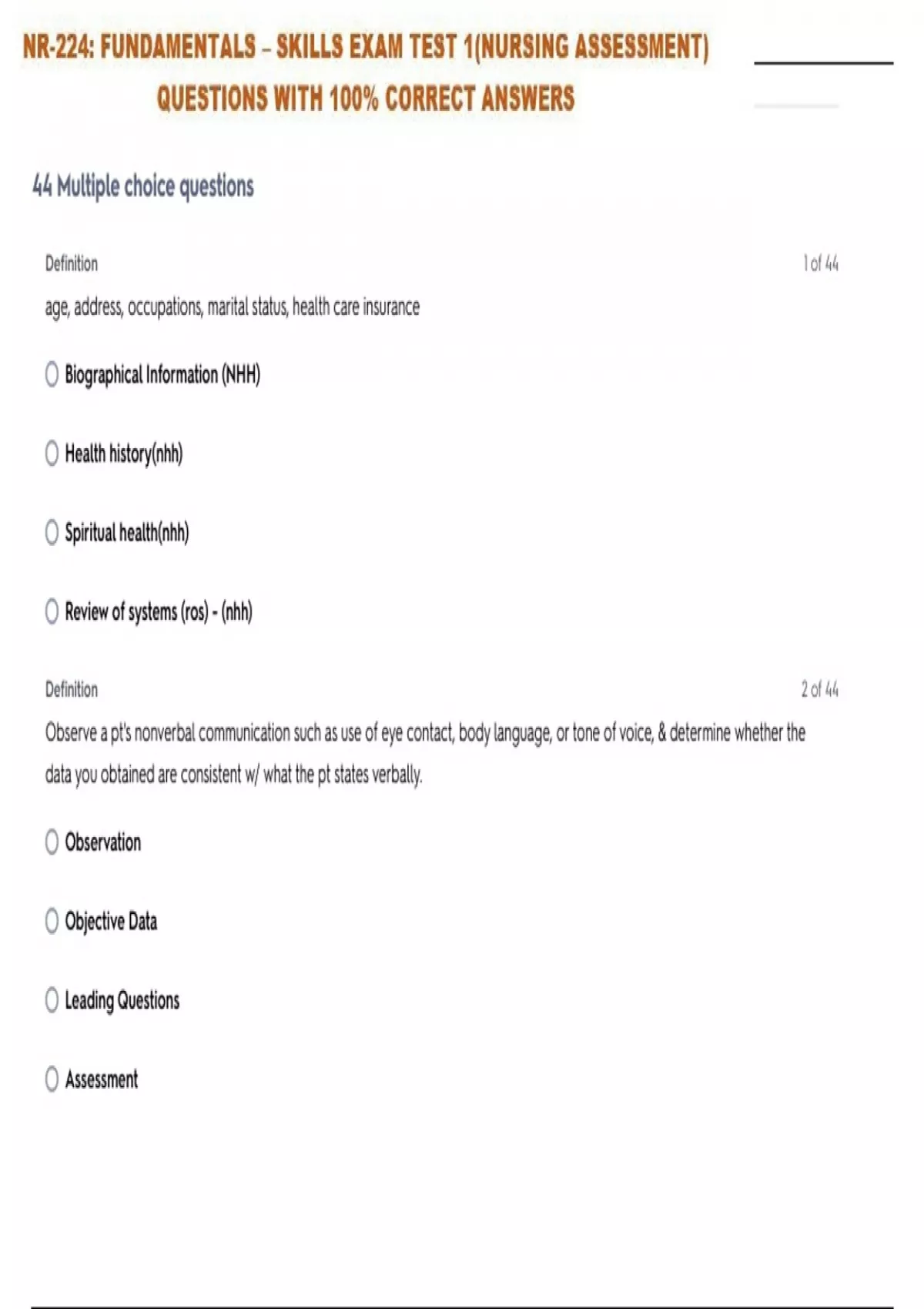 NR-224: FUNDAMENTALS – SKILLS EXAM TEST 1(NURSING ASSESSMENT) QUESTIONS WITH 100% CORRECT ANSWERS
