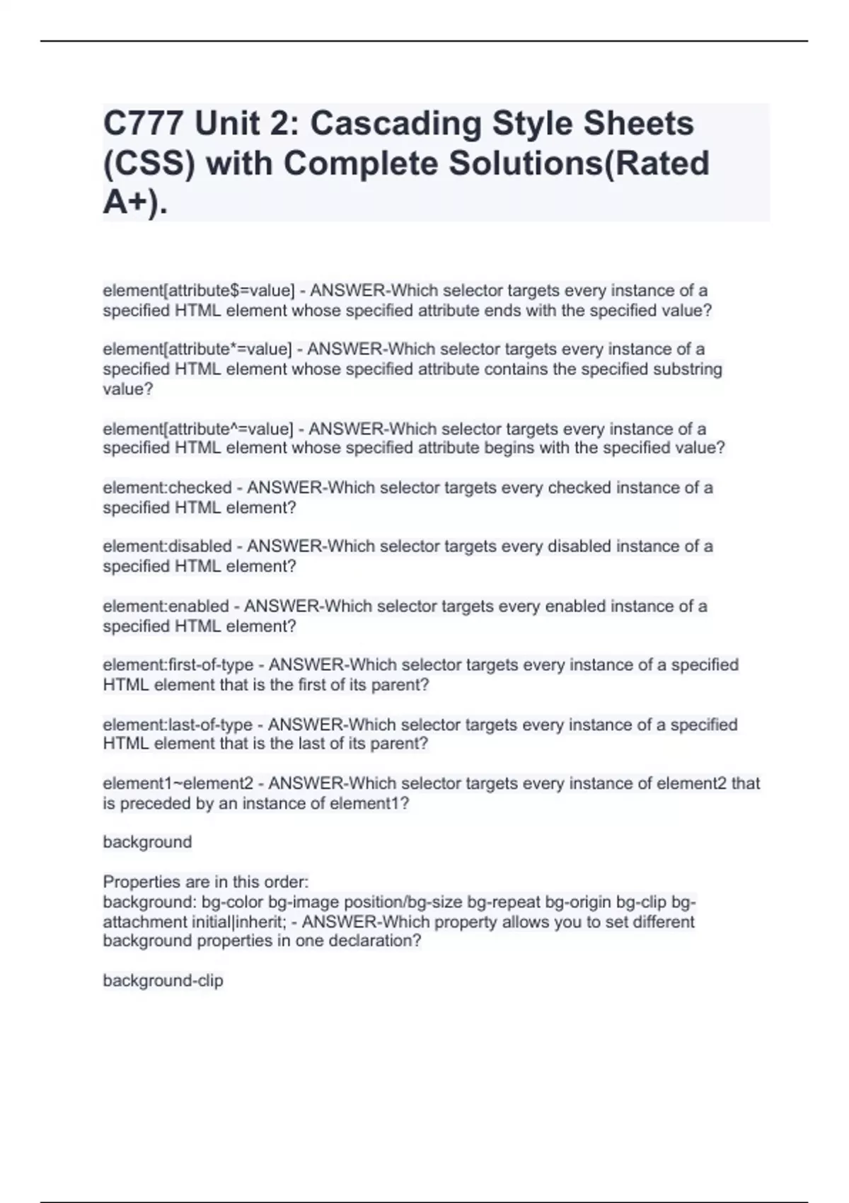 C777 Unit 2: Cascading Style Sheets (CSS) with Complete Solutions(Rated A+). element[attribute$=value] - ANSWER-Which selector targets every instance of a specified HTML element whose specified attribute ends with the specified value? element[attribute*=value] - ANSWER-Which selector targets every instance of a specified HTML element whose specified attribute contains the specified substring value? element[attribute^=value] - ANSWER-Which selector targets every instance of a specified HTML element whose specified attribute begins with the specified value? element:checked - ANSWER-Which selector targets every checked instance of a specified HTML element? element:disabled - ANSWER-Which selector targets every disabled instance of a specified HTML element? element:enabled - ANSWER-Which selector targets every enabled instance of a specified HTML element? element:first-of-type - ANSWER-Which selector targets every instance of a specified HTML element that is the first of its parent? element:last-of-type - ANSWER-Which selector targets every instance of a specified HTML element that is the last of its parent? element1~element2 - ANSWER-Which selector targets every instance of element2 that is preceded by an instance of element1? background Properties are in this order: background: bg-color bg-image position/bg-size bg-repeat bg-origin bg-clip bg-attachment initial|inherit; - ANSWER-Which property allows you to set different background properties in one declaration? background-clip Key values for this property: border-box - extends behind the border padding-box - extends to the inside edge of the border content-box - extends to the edge of the content box - ANSWER-Which property specifies whether the background extends into the border or not? background-origin Key values for this property: padding-box - from the upper left corner of the padding edge border-box - from the upper left corner of the border content-box - from the upper left corner of the content - ANSWER-Which property positions the background-image relative to an element's border, padding or content? background-size Key values for this property: length - specifies width and height in fixed units percentage - specifies width and height in in relation to the parent element cover - cover the entire container, even if it has to stretch the image or cut a little bit off one of the edges contain - resize the background image to make sure the image is fully visible - ANS