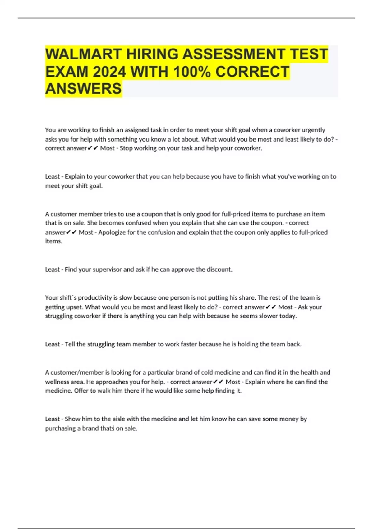 WALMART HIRING ASSESSMENT TEST EXAM 2024 WITH 100% CORRECT ANSWERS