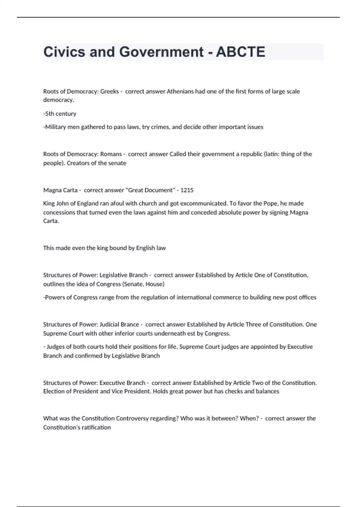 Civics and Government - ABCTE Roots of Democracy: Greeks - correct answer Athenians had one of the first forms of large scale democracy. -5th century -Military men gathered to pass laws, try crimes, and decide other important issues Roots of Democracy: Romans - correct answer Called their government a republic (latin: thing of the people). Creators of the senate Magna Carta - correct answer "Great Document" - 1215 King John of England ran afoul with church and got excommunicated. To favor the Pope, he made concessions that turned even the laws against him and conceded absolute power by signing Magna Carta. This made even the king bound by English law Structures of Power: Legislative Branch - correct answer Established by Article One of Constitution, outlines the idea of Congress (Senate, House) -Powers of Congress range from the regulation of international commerce to building new post offices Structures of Power: Judicial Brance - correct answer Established by Article Three of Constitution. One Supreme Court with other inferior courts underneath est by Congress. - Judges of both courts hold their positions for life. Supreme Court judges are appointed by Executive Branch and confirmed by Legislative Branch Structures of Power: Executive Branch - correct answer Established by Article Two of the Constitution. Election of President and Vice President. Holds great power but has checks and balances What was the Constitution Controversy regarding? Who was it between? When? - correct answer the Constitution's ratification Federalists v. Anti-Federalists