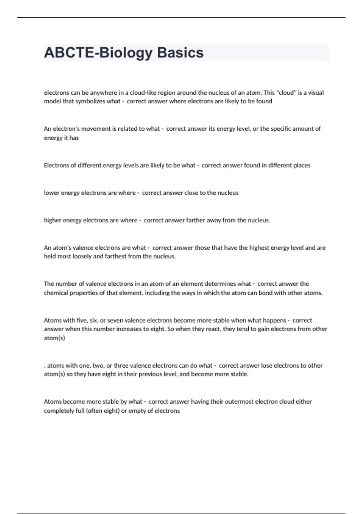 ABCTE-Biology Basics electrons can be anywhere in a cloud-like region around the nucleus of an atom. This "cloud" is a visual model that symbolizes what - correct answer where electrons are likely to be found An electron's movement is related to what - correct answer its energy level, or the specific amount of energy it has Electrons of different energy levels are likely to be what - correct answer found in different places lower energy electrons are where - correct answer close to the nucleus higher energy electrons are where - correct answer farther away from the nucleus. An atom's valence electrons are what - correct answer those that have the highest energy level and are held most loosely and farthest from the nucleus. The number of valence electrons in an atom of an element determines what - correct answer the chemical properties of that element, including the ways in which the atom can bond with other atoms. Atoms with five, six, or seven valence electrons become more stable when what happens - correct answer when this number increases to eight. So when they react, they tend to gain electrons from other atom(s) , atoms with one, two, or three valence electrons can do what - correct answer lose electrons to other atom(s) so they have eight in their previous level, and become more stable. Atoms become more stable by what - correct answer having their outermost electron cloud either completely full (often eight) or empty of electrons When these two types of atoms combine, electrons are transferred from one atom to another, making the atoms more stable and able to bond tightly together in what - correct answer an ionic bond. The other type of chemical bond occurs when it is easier for two or more atoms to share electrons and is called what. - correct answer a covalent bond. A covalent bond is formed when what happens - correct answer when the total number of shared valence electrons completely fills or empties the outermost electron level. Covalent bonds usually form between what - correct answer atoms of non-metals, ionic bonds usually form between what - correct answer a metal and a non-metal. Covalent bonds are mostly responsible for what - correct answer holding hydrogen and oxygen atoms together in a water molecule In covalent bonding, the atoms sometimes have a partial electrical charge (positive or negative), because of what - correct answer the unequal sharing of the electrons In covalent bonding, Often one of the atoms will draw an unequal share of the electrons around it leaving the other atom with what - correct answer a smaller amount of electrons The atom that draws the most electrons also receives what - correct answer their negative charge giving that part of the atom a partial negative charge In covalent bonding, The other atom has fewer electrons around it, so it has what - correct answer a slight positive charge provided by the protons in the nucleus, and absence of electrons in the orbitals. This type of compound is called a polar compound because of what - correct answer because it has a slight positive and a slight negative region.