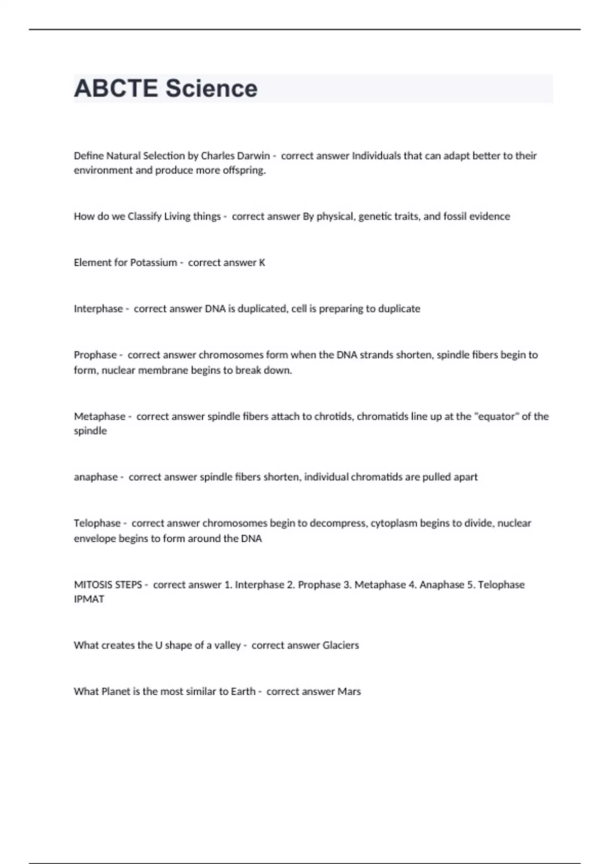 ABCTE ScienceDefine Natural Selection by Charles Darwin - correct answer Individuals that can adapt better to their environment and produce more offspring. How do we Classify Living things - correct answer By physical, genetic traits, and fossil evidence Element for Potassium - correct answer K Interphase - correct answer DNA is duplicated, cell is preparing to duplicate Prophase - correct answer chromosomes form when the DNA strands shorten, spindle fibers begin to form, nuclear membrane begins to break down. Metaphase - correct answer spindle fibers attach to chrotids, chromatids line up at the "equator" of the spindle anaphase - correct answer spindle fibers shorten, individual chromatids are pulled apart Telophase - correct answer chromosomes begin to decompress, cytoplasm begins to divide, nuclear envelope begins to form around the DNA MITOSIS STEPS - correct answer 1. Interphase 2. Prophase 3. Metaphase 4. Anaphase 5. Telophase IPMAT What creates the U shape of a valley - correct answer Glaciers What Planet is the most similar to Earth - correct answer Mars