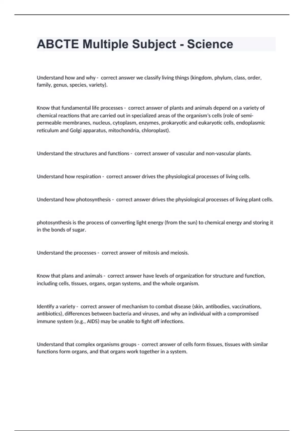 ABCTE Multiple Subject - ScienceUnderstand how and why - correct answer we classify living things (kingdom, phylum, class, order, family, genus, species, variety). Know that fundamental life processes - correct answer of plants and animals depend on a variety of chemical reactions that are carried out in specialized areas of the organism's cells (role of semi-permeable membranes, nucleus, cytoplasm, enzymes, prokaryotic and eukaryotic cells, endoplasmic reticulum and Golgi apparatus, mitochondria, chloroplast). Understand the structures and functions - correct answer of vascular and non-vascular plants. Understand how respiration - correct answer drives the physiological processes of living cells. Understand how photosynthesis - correct answer drives the physiological processes of living plant cells. photosynthesis is the process of converting light energy (from the sun) to chemical energy and storing it in the bonds of sugar. Understand the processes - correct answer of mitosis and meiosis. Know that plans and animals - correct answer have levels of organization for structure and function, including cells, tissues, organs, organ systems, and the whole organism. Identify a variety - correct answer of mechanism to combat disease (skin, antibodies, vaccinations, antibiotics), differences between bacteria and viruses, and why an individual with a compromised immune system (e.g., AIDS) may be unable to fight off infections. Understand that complex organisms groups - correct answer of cells form tissues, tissues with similar functions form organs, and that organs work together in a system. Know structures and related functions - correct answer of systems in plans and animals, such as reproductive, respiratory, circulatory, digestive, and waste disposal systems and concept of homeostasis. Identify the characteristics - correct answer that distinguish plant cells from animal cells, including chloroplasts and cell walls. Understand principles of chemistry - correct answer underlying the functioning of biological systems, including carbon's central role in living organisms, water and salt, DNA, pH, catalysis (enzymes), equilibrium, and the energetics of photosynthesis/respiration. Compare joints in the body - correct answer (wrist, shoulder, thigh) with structures used in machines and simple devices (hinge, ball-and-socket, and sliding joints). Know how levers confer mechanical advantage - correct answer and how the application of this principle applies to the muscular-skeletal system. Identify the characteristics - correct answer of most living organisms (e.g., growth, reproductions, and stimulus response). Understand the basic needs - correct answer of all living organisms to live and grow (e.g., food, water and space) and examples of diverse life forms in different environments (oceans, deserts, tundra, forests, grasslands, and wetlands). Describe the importance of cycles - correct answer in nature (life cycles, water cycle, carbon cycle, nitrogen cycle, oxygen cycle, nutrient cycle, energy cycle, seasonal cycles). Know the external characteristics and adaptations - correct answer of plants and animals, some of the fundamental principles of physiology, and how adaptation and accommodation relate to the survival and fitness of the organism, including the concept of extinction. Identify the biotic and abiotic - correct answer components of various biomes.