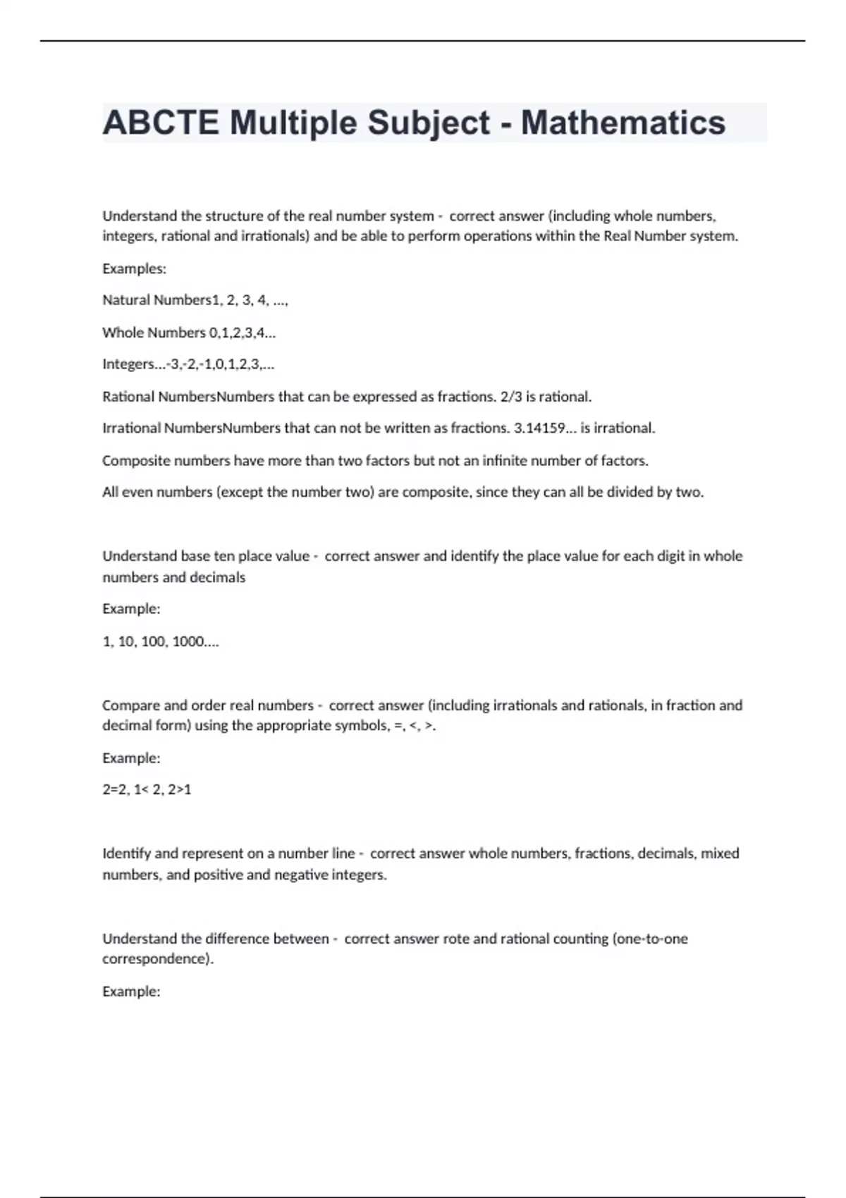 ABCTE Multiple Subject - MathematicsUnderstand the structure of the real number system - correct answer (including whole numbers, integers, rational and irrationals) and be able to perform operations within the Real Number system. Examples: Natural Numbers1, 2, 3, 4, ..., Whole Numbers 0,1,2,3,4... Integers...-3,-2,-1,0,1,2,3,... Rational NumbersNumbers that can be expressed as fractions. 2/3 is rational. Irrational NumbersNumbers that can not be written as fractions. 3.14159... is irrational. Composite numbers have more than two factors but not an infinite number of factors. All even numbers (except the number two) are composite, since they can all be divided by two. Understand base ten place value - correct answer and identify the place value for each digit in whole numbers and decimals Example: 1, 10, 100, 1000.... Compare and order real numbers - correct answer (including irrationals and rationals, in fraction and decimal form) using the appropriate symbols, =, <, >. Example: 2=2, 1< 2, 2>1 Identify and represent on a number line - correct answer whole numbers, fractions, decimals, mixed numbers, and positive and negative integers. Understand the difference between - correct answer rote and rational counting (one-to-one correspondence). Example: