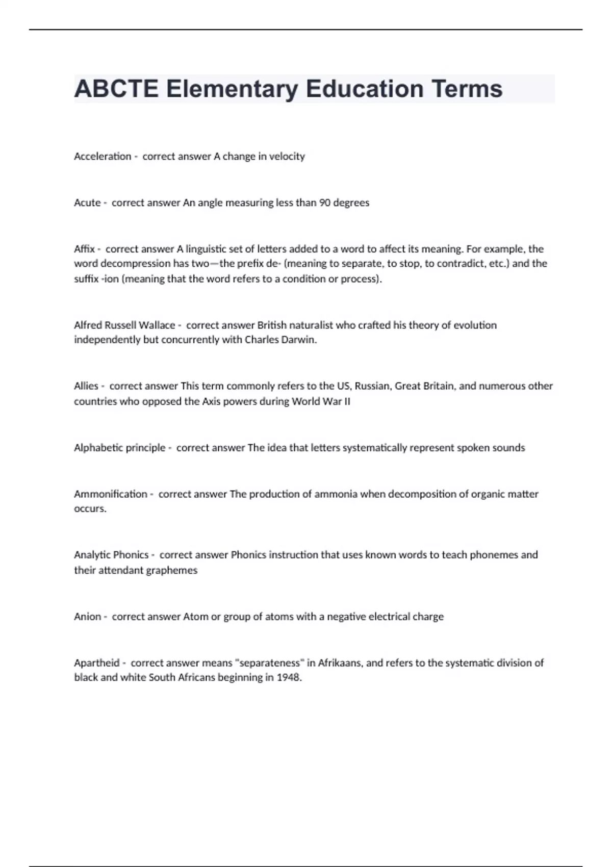 ABCTE Elementary Education TermsAcceleration - correct answer A change in velocity Acute - correct answer An angle measuring less than 90 degrees Affix - correct answer A linguistic set of letters added to a word to affect its meaning. For example, the word decompression has two—the prefix de- (meaning to separate, to stop, to contradict, etc.) and the suffix -ion (meaning that the word refers to a condition or process). Alfred Russell Wallace - correct answer British naturalist who crafted his theory of evolution independently but concurrently with Charles Darwin. Allies - correct answer This term commonly refers to the US, Russian, Great Britain, and numerous other countries who opposed the Axis powers during World War II Alphabetic principle - correct answer The idea that letters systematically represent spoken sounds Ammonification - correct answer The production of ammonia when decomposition of organic matter occurs. Analytic Phonics - correct answer Phonics instruction that uses known words to teach phonemes and their attendant graphemes Anion - correct answer Atom or group of atoms with a negative electrical charge Apartheid - correct answer means "separateness" in Afrikaans, and refers to the systematic division of black and white South Africans beginning in 1948.