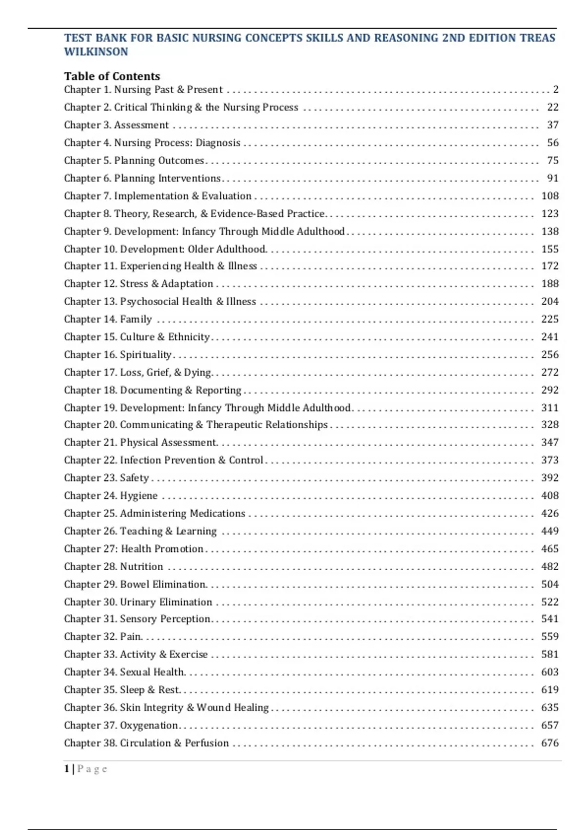 TEST BANK FOR BASIC NURSING CONCEPTS SKILLS AND REASONING 2ND EDITION TREAS WILKINSONTable of Contents Chapter 1. Nursing Past & Present ................................ ............................ 2 Chapter 2. Critical Thinking & the Nursing Process ................................ ............ 22 Chapter 3. Assessment ................................ ................................ .... 37 Chapter 4. Nursing Process: Diagnosis ................................ ....................... 56 Chapter 5. Planning Outcomes ................................ .............................. 75 Chapter 6. Planning Interventions ................................ ........................... 91 Chapter 7. Implementation & Evaluation ................................ .................... 108 Chapter 8. Theory, Research, & Evidence-Based Practice ................................ ....... 123 Chapter 9. Development: Infancy Through Middle Adulthood ................................ ... 138 Chapter 10. Development: Older Adulthood ................................ .................. 155 Chapter 11. Experiencing Health & Illness ................................ ................... 172 Chapter 12. Stress & Adaptation ................................ ........................... 188 Chapter 13. Psychosocial Health & Illness ................................ ................... 204 Chapter 14. Family ................................ ................................ ...... 225 Chapter 15. Culture & Ethnicity ................................ ............................ 241 Chapter 16. Spirituality ................................ ................................ ... 256 Chapter 17. Loss, Grief, & Dying................................ ............................ 272 Chapter 18. Documenting & Reporting ................................ ...................... 292 Chapter 19. Development: Infancy Through Middle Adulthood ................................ .. 311 Chapter 20. Communicating & Therapeutic Relationships ................................ ...... 328 Chapter 21. Physical Assessment ................................ ........................... 347 Chapter 22. Infection Prevention & Control ................................ .................. 373 Chapter 23. Safety ................................ ................................ ....... 392 Chapter 24. Hygiene ................................ ................................ ..... 408 Chapter 25. Administering Medications ................................ ..................... 426 Chapter 26. Teaching & Learning ................................ .......................... 449 Chapter 27: Health Promotion ................................ ............................. 465 Chapter 28. Nutrition ................................ ................................ .... 482 Chapter 29. Bowel Elimination................................ ............................. 504 Chapter 30. Urinary Elimination ................................ ........................... 522 Chapter 31. Sensory Perception ................................ ............................ 541 Chapter 32. Pain................................ ................................ ......... 559 Chapter 33. Activity & Exercise ................................ ............................ 581 Chapter 34. Sexual Health ................................ ................................ . 603 Chapter 35. Sleep & Rest ................................ ................................ .. 619 Chapter 36. Skin Integrity & Wound Healing ................................ ................. 635 Chapter 37. Oxygenation ................................ ................................ .. 657 Chapter 38. Circulation & Perfusion ................................ ........................ 676 1 | P a g eChapter 39. Fluids, Electrolytes, & Acid–Base Balance ................................ ......... 692 Chapter 40. Perioperative Nursing ................................ ......................... 715 Chapter 41. Leading & Managing ................................ ........................... 734 Chapter 42. Community & Home Health Nursing ................................ ............. 749 Chapter 43. Ethics & Values ................................ ............................... 771 Chapter 44. Legal Accountability ................................ ........................... 787 Chapter 45. Nursing Informatics ................................ ........................... 803 Chapter 46. Holistic Healing ................................ ............................... 818 Chapter 1. Nursing Past & Present MULTIPLE CHOICE 2 | P a g e1. Which is the most influential factor that has shaped the nursing profession? 1) Physicians’ need for handmaidens 2) Societal need for healthcare outside the home 3) Military demand for nurses in the field 4) Germ theory influence on sanitation ANS: 3 Chapter number and title: 1, Nursing Past & Present Chapter learning objective: Define nursing in your own words. Chapter page reference: p. 7 Heading: Historical Context of Nursing Integrated Processes: Teaching and Learning Client Need: Safe and Effective Care Environment: Management of Care Cognitive level: Comprehension [Understanding] Concept: Professionalism Difficulty: Easy Feedback 1 The physician's handmaiden was/is a nursing stereotype rather than an influence on nursing. 2 Although there has been a need for healthcare outside the home throughout history, this has more influenceonthedevelopment of hospitals than on nursing; this need provided one more setting for nursing work. 3 Throughout the centuries, stability of the government has been related to the success of the military to protect or extend its domain. As the survival and well-being of soldiers are both critical, nurses provided healthcare to the sick and injured at the battle site. 4 Germ theory and sanitation helped to improve healthcare but did not shape nursing. PTS: 1 CON: Professionalism 2. Wh