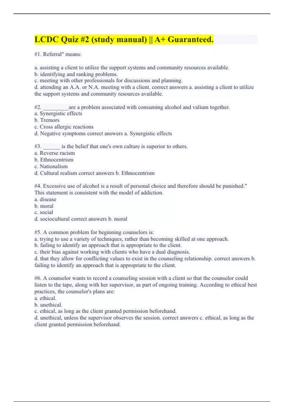 #1. Referral" means: a. assisting a client to utilize the support systems and community resources available. b. identifying and ranking problems. c. meeting with other professionals for discussions and planning. d. attending an A.A. or N.A. meeting with a client. correct answers a. assisting a client to utilize the support systems and community resources available. #2. _________are a problem associated with consuming alcohol and valium together. a. Synergistic effects b. Tremors c. Cross allergic reactions d. Negative symptoms correct answers a. Synergistic effects #3. ______ is the belief that one's own culture is superior to others. a. Reverse racism b. Ethnocentrism c. Nationalism d. Cultural realism correct answers b. Ethnocentrism #4. Excessive use of alcohol is a result of personal choice and therefore should be punished." This statement is consistent with the model of addiction. a. disease b. moral c. social d. sociocultural correct answers b. moral #5. A common problem for beginning counselors is: a. trying to use a variety of techniques, rather than becoming skilled at one approach. b. failing to identify an approach that is appropriate to the client. c. their bias against working with clients who have a dual diagnosis. d. that they allow for conflicting values to exist in the counseling relationship. correct answers b. failing to identify an approach that is appropriate to the client. #6. A counselor wants to record a counseling session with a client so that the counselor could listen to the tape, along with her supervisor, as part of ongoing training. According to ethical best practices, the counselor's plans are: a. ethical. b. unethical. c. ethical, as long as the client granted permission beforehand. d. unethical, unless the supervisor observes the session. correct answers c. ethical, as long as the client granted permission beforehand.