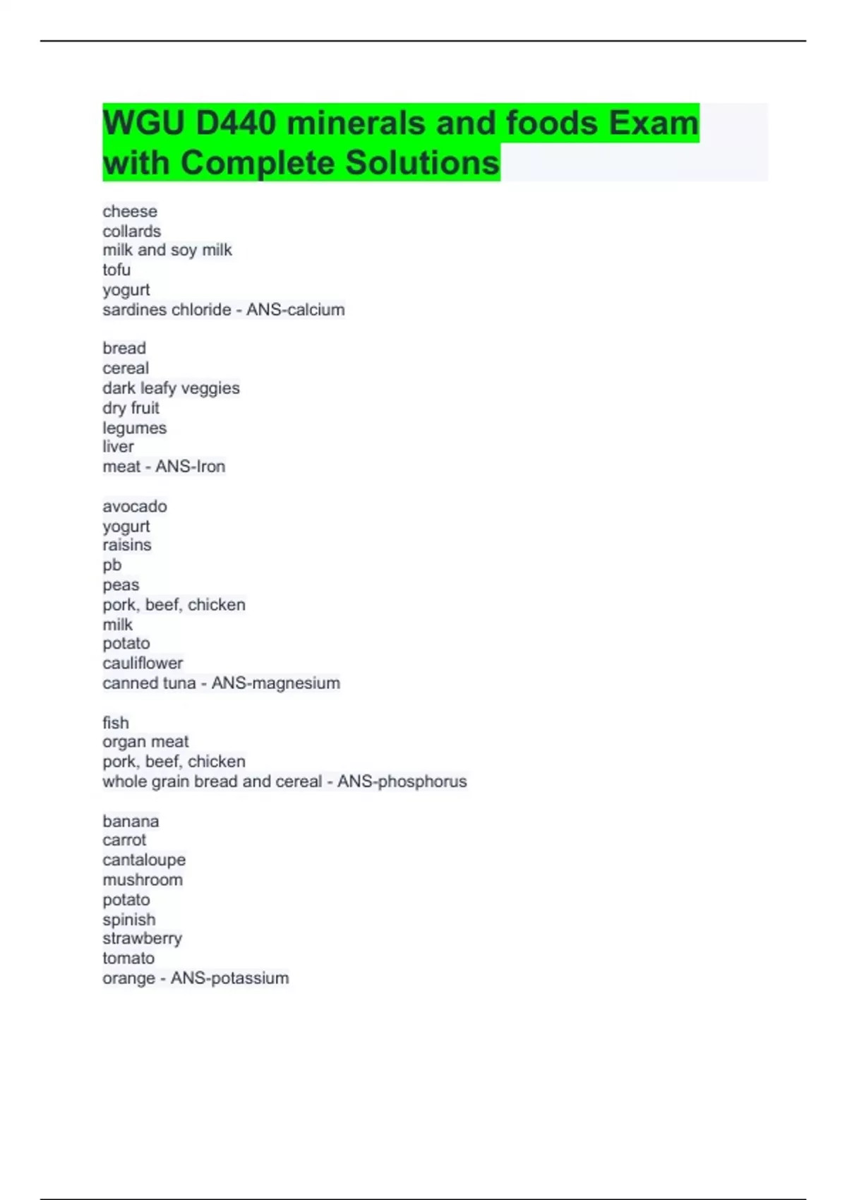WGU D440 minerals and foods Exam with Complete Solutions
