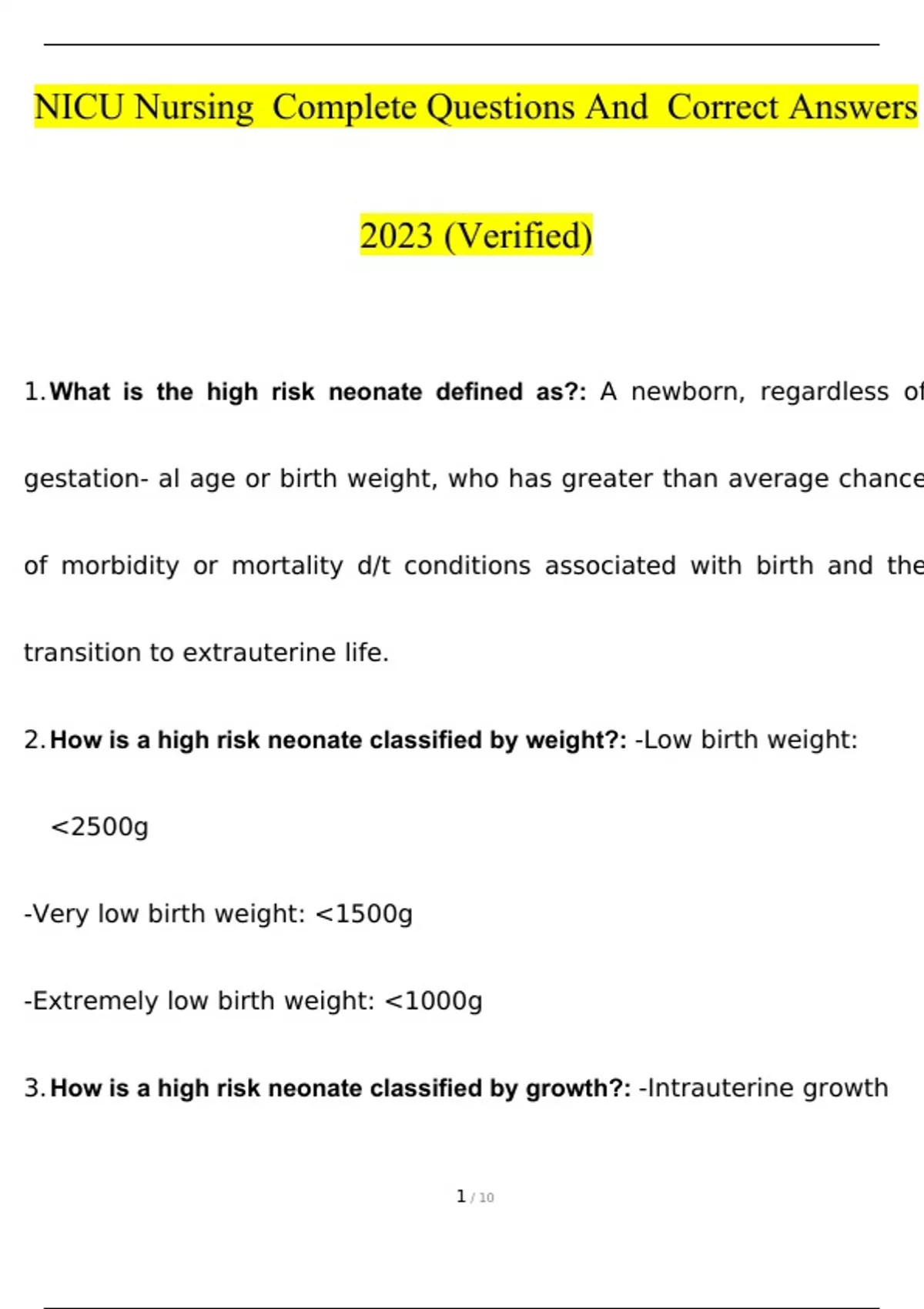 NICU Nursing | Complete Questions And Answers With Verified Solutions 2023