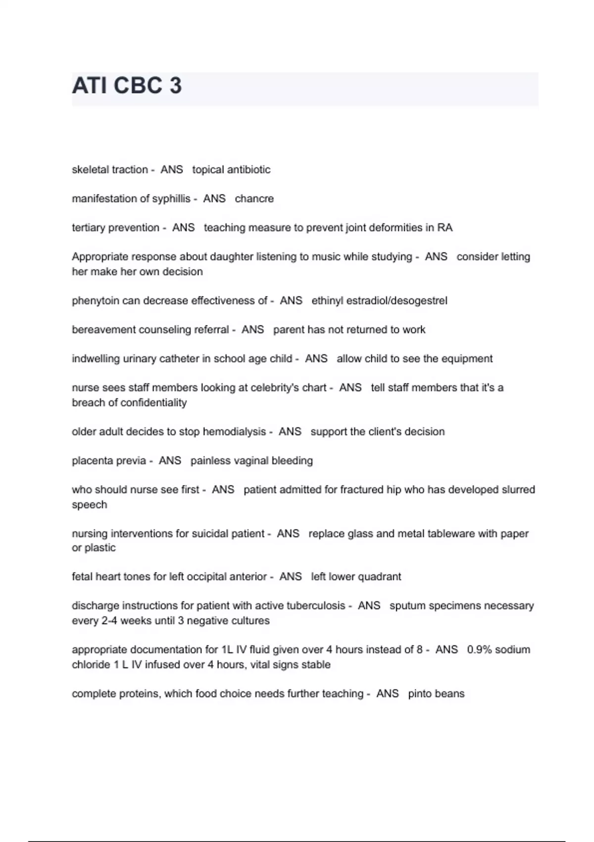 ATI CBC 3 Exam Questions And Answers skeletal traction - ANS topical antibiotic manifestation of syphillis - ANS chancre tertiary prevention - ANS teaching measure to prevent joint deformities in RA Appropriate response about daughter listening to music while studying - ANS consider letting her make her own decision phenytoin can decrease effectiveness of - ANS ethinyl estradiol/desogestrel bereavement counseling referral - ANS parent has not returned to work indwelling urinary catheter in school age child - ANS allow child to see the equipment nurse sees staff members looking at celebrity's chart - ANS tell staff members that it's a breach of confidentiality older adult decides to stop hemodialysis - ANS support the client's decision placenta previa - ANS painless vaginal bleeding who should nurse see first - ANS patient admitted for fractured hip who has developed slurred speech nursing interventions for suicidal patient - ANS replace glass and metal tableware with paper or plastic fetal heart tones for left occipital anterior - ANS left lower quadrant discharge instructions for patient with active tuberculosis - ANS sputum specimens necessary every 2-4 weeks until 3 negative cultures appropriate documentation for 1L IV fluid given over 4 hours instead of 8 - ANS 0.9% sodium chloride 1 L IV infused over 4 hours, vital signs stable