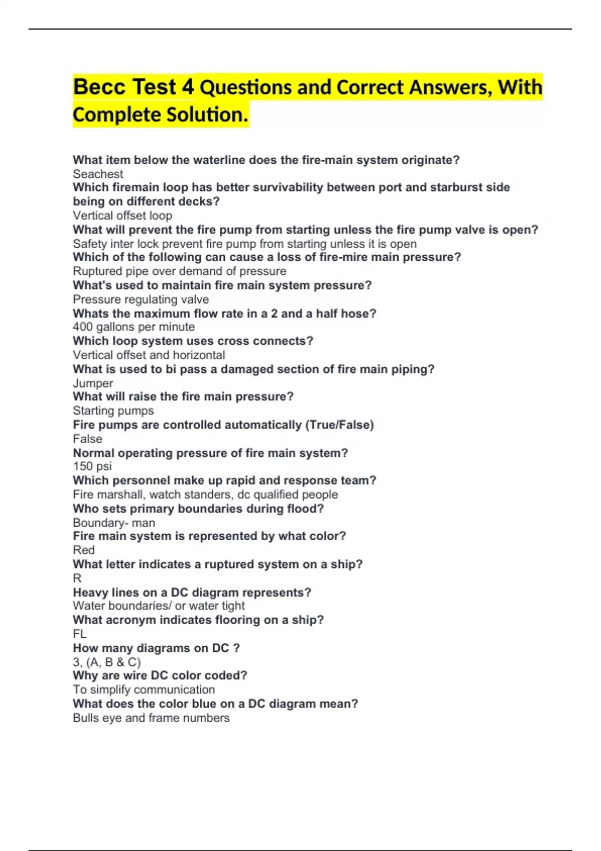 Becc Test 4 Questions and Correct Answers, With Complete Solution. What item below the waterline does the fire-main system originate? Seachest Which firemain loop has better survivability between port and starburst side being on different decks? Vertical offset loop What will prevent the fire pump from starting unless the fire pump valve is open? Safety inter lock prevent fire pump from starting unless it is open Which of the following can cause a loss of fire-mire main pressure? Ruptured pipe over demand of pressure What's used to maintain fire main system pressure? Pressure regulating valve Whats the maximum flow rate in a 2 and a half hose? 400 gallons per minute Which loop system uses cross connects? Vertical offset and horizontal What is used to bi pass a damaged section of fire main piping? Jumper What will raise the fire main pressure? Starting pumps Fire pumps are controlled automatically (True/False) False Normal operating pressure of fire main system? 150 psi Which personnel make up rapid and response team? Fire marshall, watch standers, dc qualified people Who sets primary boundaries during flood? Boundary- man Fire main system is represented by what color? Red What letter indicates a ruptured system on a ship? R Heavy lines on a DC diagram represents? Water boundaries/ or water tight What acronym indicates flooring on a ship? FL How many diagrams on DC ? 3, (A, B & C) Why are wire DC color coded? To simplify communication What does the color blue on a DC diagram mean? Bulls eye and frame numbers What power is a sound powered telephone? Sound waves X40J? Casualty communication circuit What can be used for hands free approach with sound powered telephone? Head set chest set Which channel dc wifcom for ship to ship? Channel 4 Which circuit letter begins with X? Auxiliary What parts act as a receiver on a headset chest set on a powered telephone? Receiver/ headset Which alarm is sounded when possibility of another ship colliding with something else? Collision If an electrical fire has been reported what type of fire is it? Charlie When a hole has been engaged what is drawn? Circle Circle around a DC symbol means? Casualty is engaged When fire is reported who proceeds to the scene to direct efforts of rapid response team? Fire marshall Circle around it with a slash through it ? Casualty has been secured and or taken care of Message blank with letter J signifies? Jammed access What position must the fuel tank valve be in prior to p-100 pump be in? Open Fuel tank capacity of p-100 pump 1.45 gallons P-100 pump diameter hose is? 2 and a half inches Carbon monoxide is dangerous when? Inhaled it is odorless and colorless What system provided provided water for the main drainage system? Fire-main supplies water for the educators How many gpm is a p-100 pump rated at? 100 gallons per minute Primary purpose of a p-100 is - firefighting and secondary is de-watering Educators minimum pressure needed to operate? 120 Voltage of the portable submersible pump? 440 volts