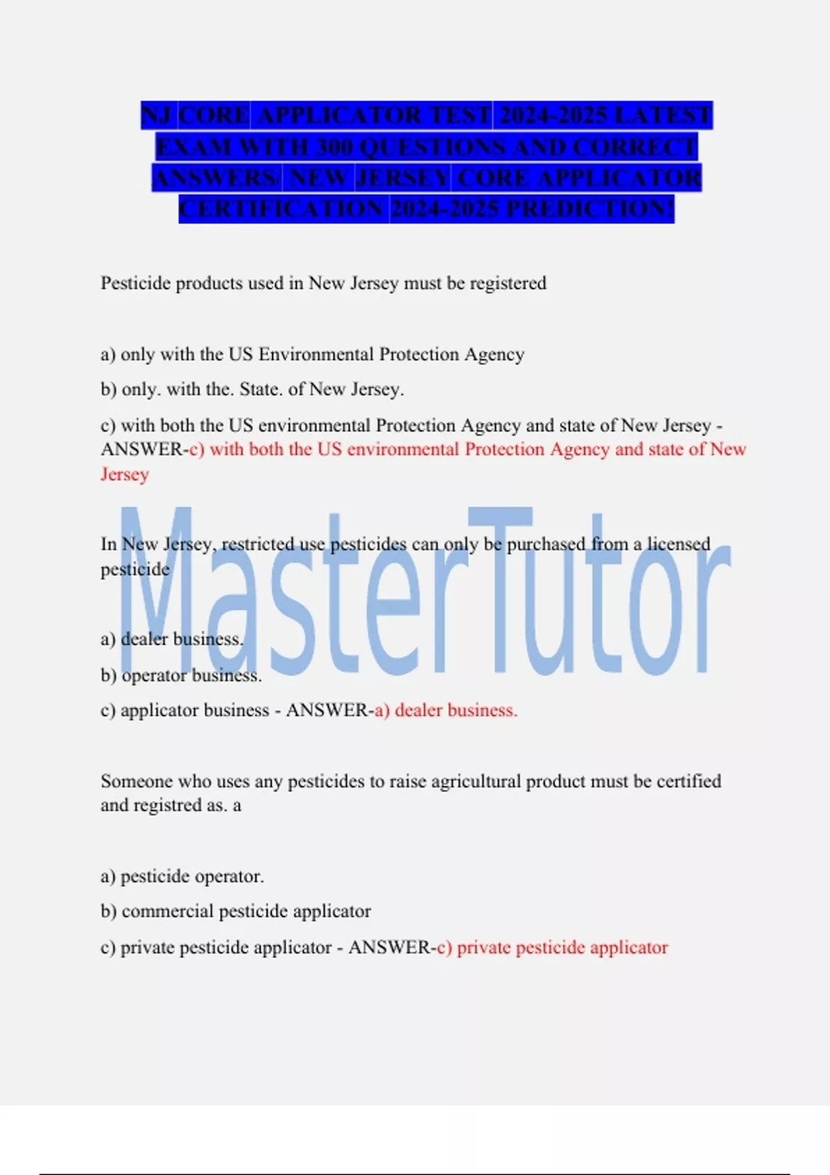 Pesticide products used in New Jersey must be registered a)only with the US Environmental Protection Agency b)only. with the. State. of New Jersey. c)with both the US environmental Protection Agency and state of New Jersey - ANSWER-c) with both the US environmental Protection Agency and state of New Jersey In New Jersey, restricted use pesticides can only be purchased from a licensed pesticide a)dealer business. b)operator business. c)applicator business - ANSWER-a) dealer business. Someone who uses any pesticides to raise agricultural product must be certified and registred as. a a)pesticide operator. b)commercial pesticide applicator c)private pesticide applicator - ANSWER-c) private pesticide applicator