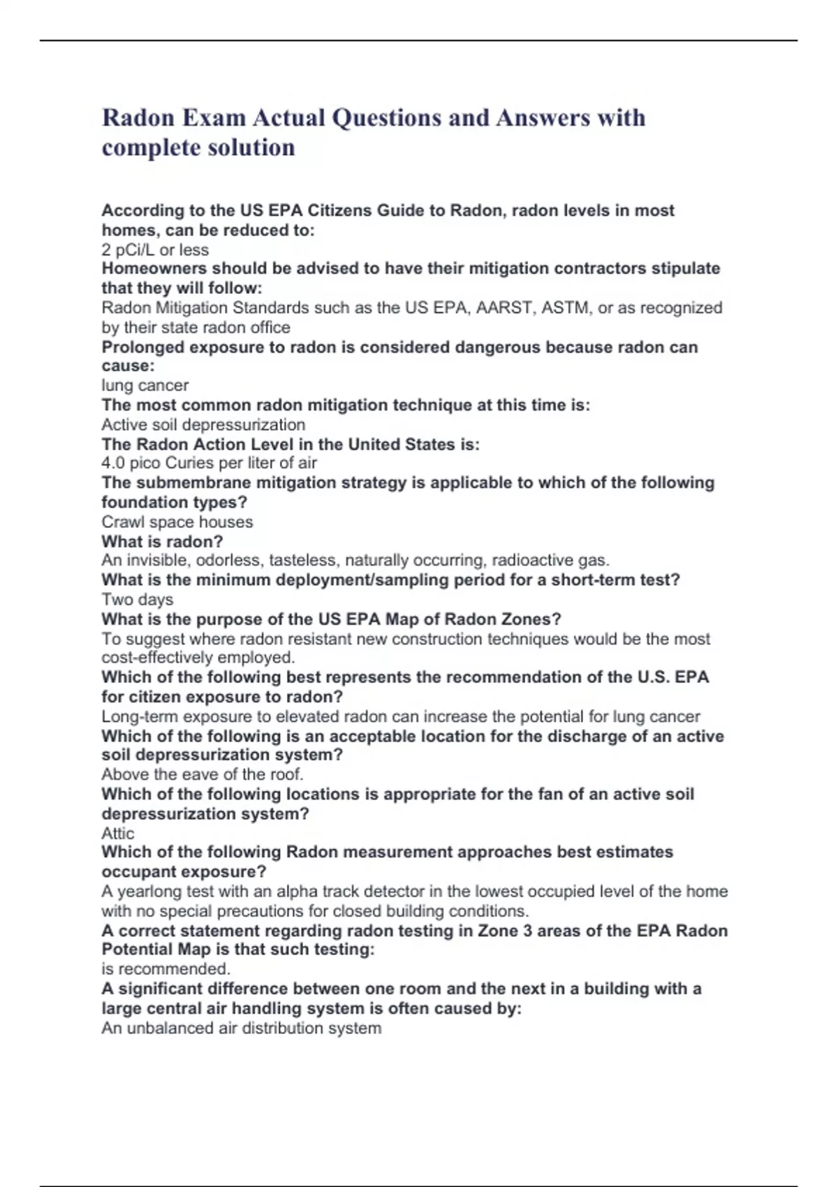 Radon Exam Actual Questions and Answers with complete solution According to the US EPA Citizens Guide to Radon, radon levels in most homes, can be reduced to: 2 pCi/L or less Homeowners should be advised to have their mitigation contractors stipulate that they will follow: Radon Mitigation Standards such as the US EPA, AARST, ASTM, or as recognized by their state radon office Prolonged exposure to radon is considered dangerous because radon can cause: lung cancer The most common radon mitigation technique at this time is: Active soil depressurization The Radon Action Level in the United States is: 4.0 pico Curies per liter of air The submembrane mitigation strategy is applicable to which of the following foundation types? Crawl space houses What is radon? An invisible, odorless, tasteless, naturally occurring, radioactive gas. What is the minimum deployment/sampling period for a short-term test? Two days What is the purpose of the US EPA Map of Radon Zones? To suggest where radon resistant new construction techniques would be the most cost-effectively employed. Which of the following best represents the recommendation of the U.S. EPA for citizen exposure to radon? Long-term exposure to elevated radon can increase the potential for lung cancer Which of the following is an acceptable location for the discharge of an active soil depressurization system? Above the eave of the roof. Which of the following locations is appropriate for the fan of an active soil depressurization system? Attic Which of the following Radon measurement approaches best estimates occupant exposure? A yearlong test with an alpha track detector in the lowest occupied level of the home with no special precautions for closed building conditions. A correct statement regarding radon testing in Zone 3 areas of the EPA Radon Potential Map is that such testing: is recommended. A significant difference between one room and the next in a building with a large central air handling system is often caused by: An unbalanced air distribution system