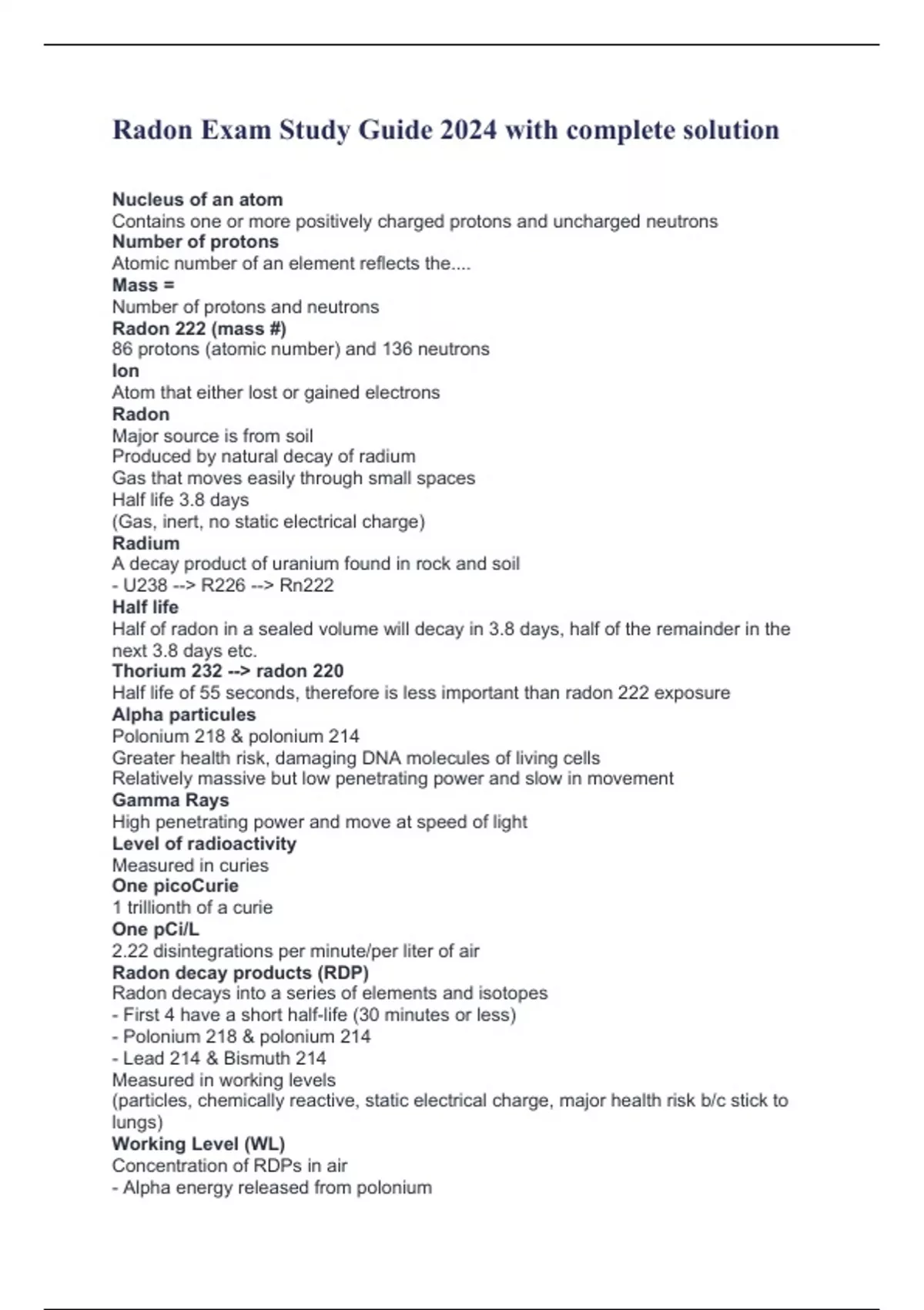 Radon Exam Study Guide 2024 with complete solution Nucleus of an atom Contains one or more positively charged protons and uncharged neutrons Number of protons Atomic number of an element reflects the.... Mass = Number of protons and neutrons Radon 222 (mass #) 86 protons (atomic number) and 136 neutrons Ion Atom that either lost or gained electrons Radon Major source is from soil Produced by natural decay of radium Gas that moves easily through small spaces Half life 3.8 days (Gas, inert, no static electrical charge) Radium A decay product of uranium found in rock and soil - U238 --> R226 --> Rn222 Half life Half of radon in a sealed volume will decay in 3.8 days, half of the remainder in the next 3.8 days etc. Thorium 232 --> radon 220 Half life of 55 seconds, therefore is less important than radon 222 exposure Alpha particules Polonium 218 & polonium 214 Greater health risk, damaging DNA molecules of living cells Relatively massive but low penetrating power and slow in movement Gamma Rays High penetrating power and move at speed of light Level of radioactivity Measured in curies One picoCurie 1 trillionth of a curie One pCi/L 2.22 disintegrations per minute/per liter of air Radon decay products (RDP) Radon decays into a series of elements and isotopes - First 4 have a short half-life (30 minutes or less) - Polonium 218 & polonium 214 - Lead 214 & Bismuth 214 Measured in working levels (particles, chemically reactive, static electrical charge, major health risk b/c stick to lungs) Working Level (WL) Concentration of RDPs in air - Alpha energy released from polonium