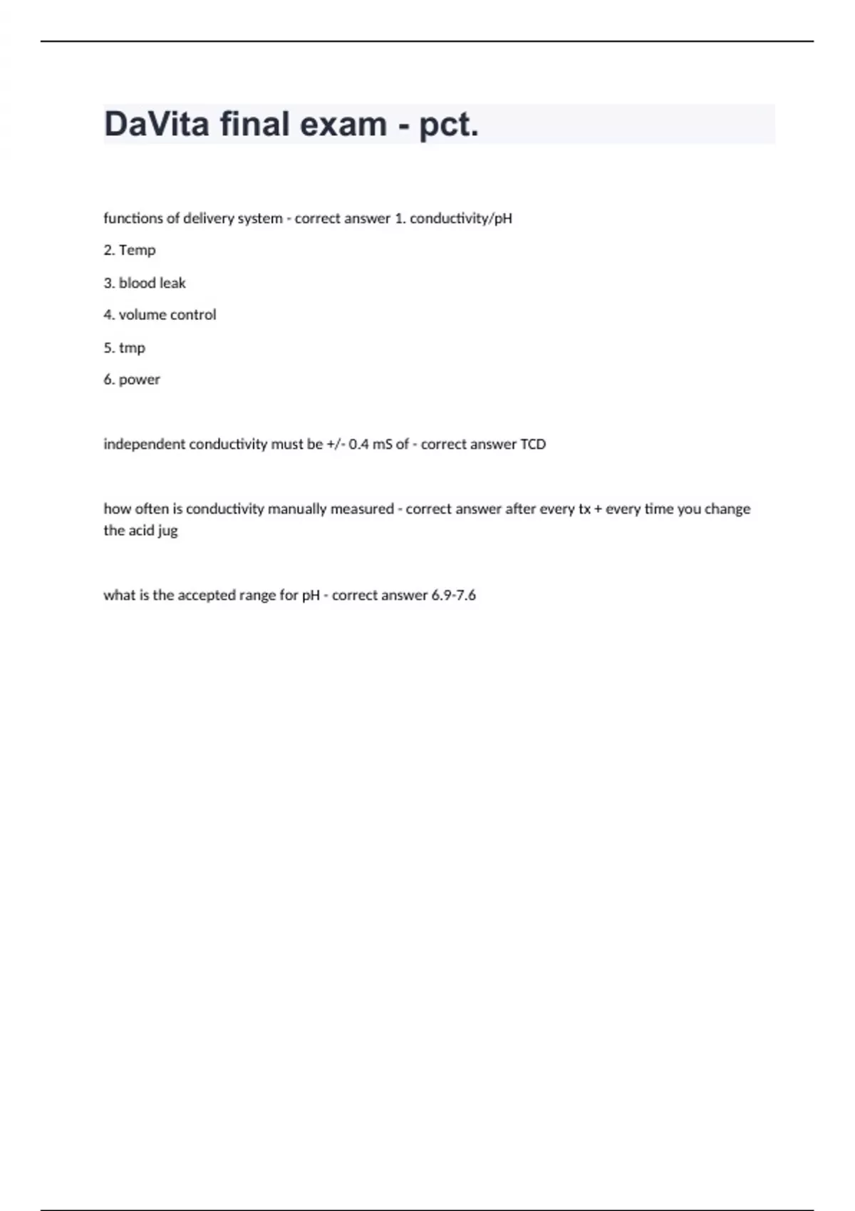 DaVita final exam - pct. functions of delivery system - correct answer 1. conductivity/pH 2. Temp 3. blood leak 4. volume control 5. tmp 6. power independent conductivity must be +/- 0.4 mS of - correct answer TCD how often is conductivity manually measured - correct answer after every tx + every time you change the acid jug what is the accepted range for pH - correct answer 6.9-7.6