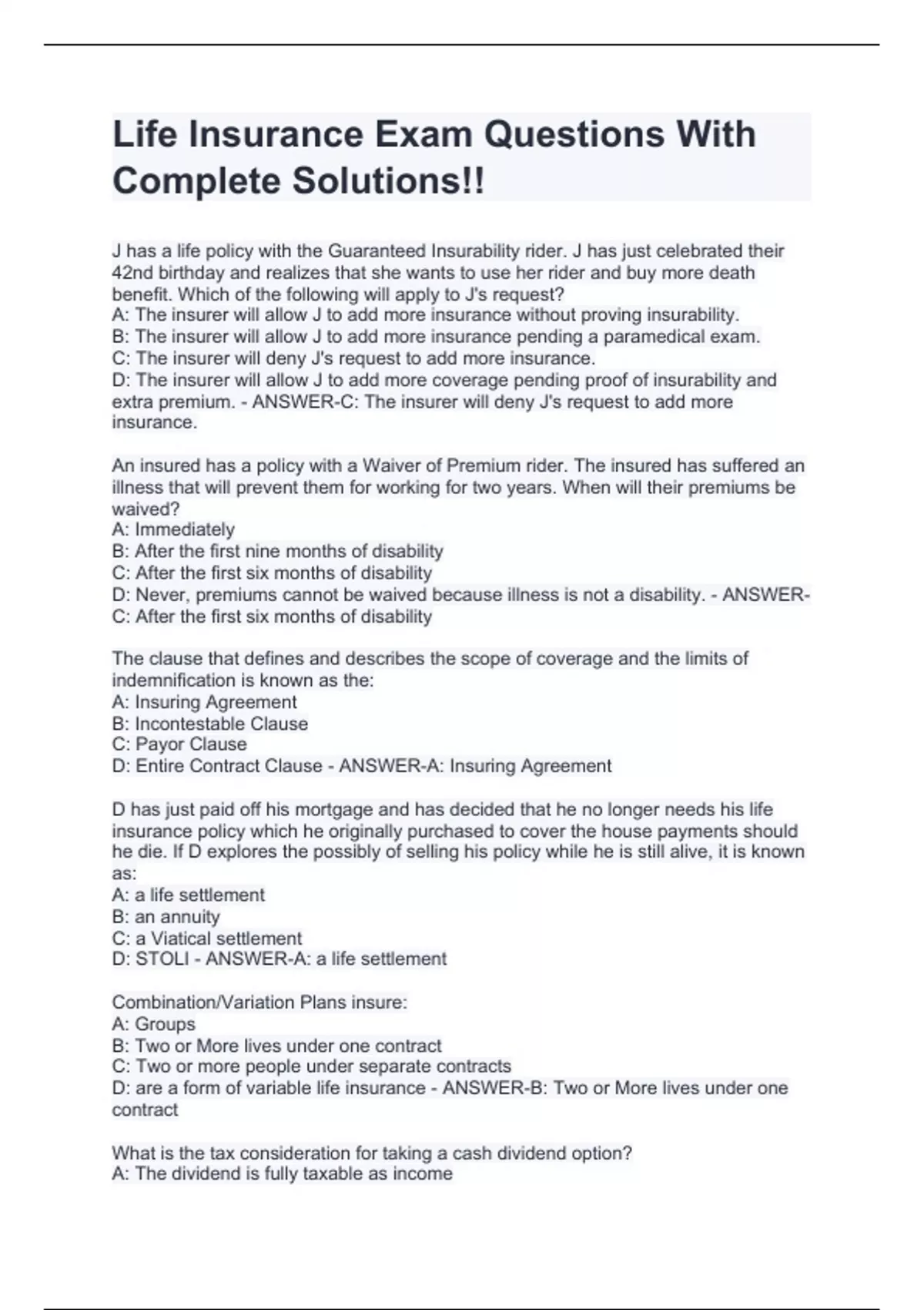 J has a life policy with the Guaranteed Insurability rider. J has just celebrated their 42nd birthday and realizes that she wants to use her rider and buy more death benefit. Which of the following will apply to J's request? A: The insurer will allow J to add more insurance without proving insurability. B: The insurer will allow J to add more insurance pending a paramedical exam. C: The insurer will deny J's request to add more insurance. D: The insurer will allow J to add more coverage pending proof of insurability and extra premium. - ANSWER-C: The insurer will deny J's request to add more insurance. An insured has a policy with a Waiver of Premium rider. The insured has suffered an illness that will prevent them for working for two years. When will their premiums be waived? A: Immediately B: After the first nine months of disability C: After the first six months of disability D: Never, premiums cannot be waived because illness is not a disability. - ANSWER-C: After the first six months of disability The clause that defines and describes the scope of coverage and the limits of indemnification is known as the: A: Insuring Agreement B: Incontestable Clause C: Payor Clause D: Entire Contract Clause - ANSWER-A: Insuring Agreement D has just paid off his mortgage and has decided that he no longer needs his life insurance policy which he originally purchased to cover the house payments should he die. If D explores the possibly of selling his policy while he is still alive, it is known as: A: a life settlement B: an annuity C: a Viatical settlement D: STOLI - ANSWER-A: a life settlement Combination/Variation Plans insure: A: Groups B: Two or More lives under one contract C: Two or more people under separate contracts D: are a form of variable life insurance - ANSWER-B: Two or More lives under one contract What is the tax consideration for taking a cash dividend option? A: The dividend is fully taxable as income B: The dividend is paid tax free C: Depending on income bracket of the insured, the dividend may be taxable D: If the company gets to keep half of the dividend it is take free - ANSWER-B: The dividend is paid tax free Which of the following is not true regarding a renewable option on a term policy? A: The policy must be renewed regardless of insurability. B: The rates cannot be more than standard rates at renewal. C: Premiums are based off of attained age rates. D: A policy can be renewed, however, the insured must convert to a different policy. - ANSWER-D: A policy can be renewed, however, the insured must convert to a different policy.