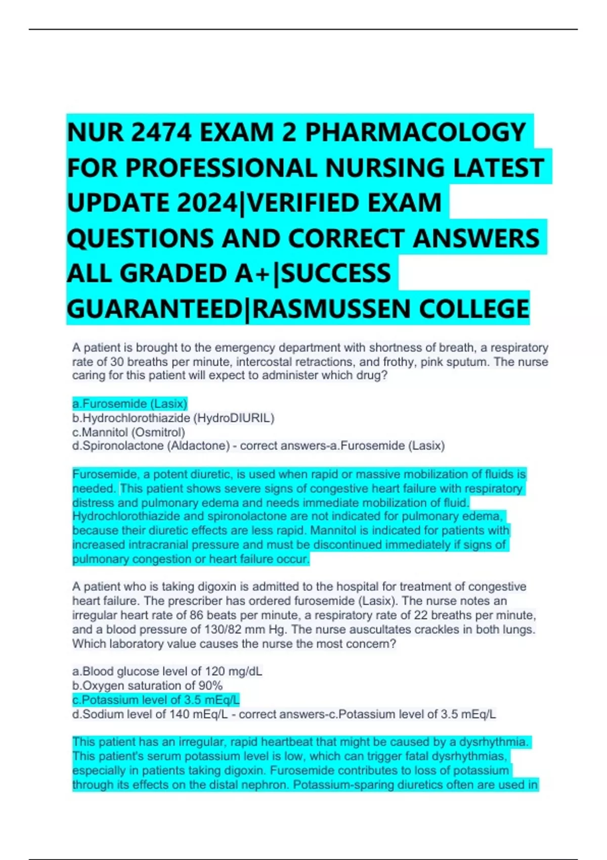 NUR 2474 EXAM 2 PHARMACOLOGY FOR PROFESSIONAL NURSING LATEST UPDATE 2024|VERIFIED EXAM QUESTIONS AND CORRECT ANSWERS ALL GRADED A+|SUCCESS GUARANTEED|RASMUSSEN COLLEGE A patient is brought to the emergency department with shortness of breath, a respiratory rate of 30 breaths per minute, intercostal retractions, and frothy, pink sputum. The nurse caring for this patient will expect to administer which drug? a.Furosemide (Lasix) b.Hydrochlorothiazide (HydroDIURIL) c.Mannitol (Osmitrol) d.Spironolactone (Aldactone) - correct answers-a.Furosemide (Lasix) Furosemide, a potent diuretic, is used when rapid or massive mobilization of fluids is needed. This patient shows severe signs of congestive heart failure with respiratory distress and pulmonary edema and needs immediate mobilization of fluid. Hydrochlorothiazide and spironolactone are not indicated for pulmonary edema, because their diuretic effects are less rapid. Mannitol is indicated for patients with increased intracranial pressure and must be discontinued immediately if signs of pulmonary congestion or heart failure occur. A patient who is taking digoxin is admitted to the hospital for treatment of congestive heart failure. The prescriber has ordered furosemide (Lasix). The nurse notes an irregular heart rate of 86 beats per minute, a respiratory rate of 22 breaths per minute, and a blood pressure of 130/82 mm Hg. The nurse auscultates crackles in both lungs. Which laboratory value causes the nurse the most concern? a.Blood glucose level of 120 mg/dL b.Oxygen saturation of 90% c.Potassium level of 3.5 mEq/L d.Sodium level of 140 mEq/L - correct answers-c.Potassium level of 3.5 mEq/L This patient has an irregular, rapid heartbeat that might be caused by a dysrhythmia. This patient's serum potassium level is low, which can trigger fatal dysrhythmias, especially in patients taking digoxin. Furosemide contributes to loss of potassium through its effects on the distal nephron. Potassium-sparing diuretics often are used in conjunction with furosemide to prevent this complication. This patient's serum glucose and sodium levels are normal and of no concern at this point, although they can be affected by furosemide. The oxygen saturation is somewhat low and needs to be monitored, although it may improve with diuresis. A patient has 2+ pitting edema of the lower extremities bilaterally. Auscultation of the lungs reveals crackles bilaterally, and the serum potassium level is 6 mEq/L. Which diuretic agent ordered by the prescriber should the nurse question? a.Bumetanide (Bumex) b.Furosemide (Lasix) c.Spironolactone (Aldactone) d.Hydrochlorothiazide (HydroDIURIL) - correct answers-c.Spironolactone (Aldactone) Spironolactone is a non-potassium-wasting diuretic; therefore, if the patient has a serum potassium level of 6 mEq/L, indicating hyperkalemia, an order for this drug should be questioned. Bumetanide, furosemide, and hydrochlorothiazide are potassium-wasting diuretics and would be appropriate to administer in a patient with hyperkalemia. A nurse preparing to administer morning medications notes that a patient with a history of hypertension has been prescribed the angiotensin-converting enzyme (ACE) inhibitor captopril (Capoten) concurrently with spironolactone (Aldactone). Morning laboratory results reveal a serum sodium level of 144 mg/dL, a serum potassium level of 5.1 mEq/L, and a blood glucose level of 128 mg/dL. Which intervention is appropriate? a.Administer the medications as ordered. b.Ask the patient about the use of salt substitutes. c.Contact the provider to report the laboratory values. d.Request an order for furosemide (Lasix). - correct answers-c.Contact the provider to report the laboratory values. Spironolactone should not be administered with ACE inhibitors, which can also elevate potassium levels. Because the potassium level is elevated, the nurse should not administer the medication and should obtain clarification of the order. There is no need to repeat the potassium level test that was just done this morning. Requesting an order for furosemide is appropriate only after the provider has been notified of the laboratory values. A patient with hypertension is taking furosemide (Lasix) for congestive heart failure. The prescriber orders digoxin to help increase cardiac output. What other medication will the nurse expect to be ordered for this patient? a.Bumetanide (Bumex) b.Chlorothiazide (Diuril) c.Hydrochlorothiazide (HydroDIURIL) d.Spironolactone (Aldactone) - correct answers-d.Spironolactone (Aldactone) Spironolactone is used in conjunction with furosemide because of its potassium-sparing effects. Furosemide can contribute to hypokalemia, which can increase the risk of fatal dysrhythmias, especially with digoxin administration. The other diuretics listed are all potassium-wasting diuretics. A patient is taking gentamicin (Garamycin) and furosemide (Lasix). The nurse should counsel this patient to report which symptom? a.Frequent nocturia b.Headaches c.Ringing in the ears d.Urinary retention - correct answers-c.Ringing in the ears Patients taking furosemide should be advised that the risk of furosemide-induced hearing loss can be increased when other ototoxic drugs, such as gentamicin, are also taken. Patients should be told to report tinnitus or dizziness or hearing loss. Nocturia may be an expected effect of furosemide. Headaches are not likely to occur with concomitant use of gentamicin and furosemide. Urinary retention is not an expected side effect. An older adult patient with congestive heart failure develops crackles in both lungs and pitting edema of all extremities. The physician orders hydrochlorothiazide (HydroDIURIL). Before administering this medication, the nurse reviews the patient's chart. Which laboratory value causes the nurse the most concern? a.Elevated creatinine clearance b.Elevated serum potassium level c.Normal blood glucose level d.Low levels of low-density lipoprotein (LDL) cholesterol - correct answ