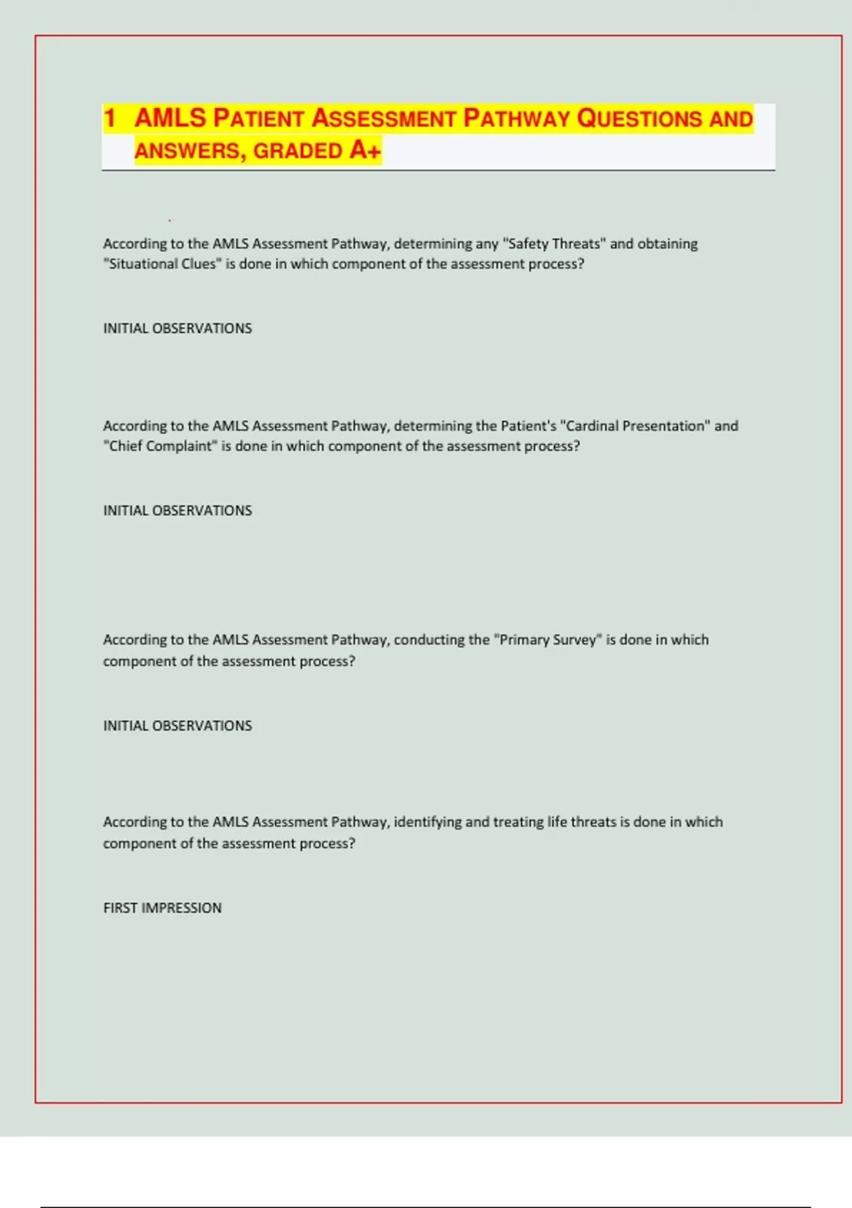 AMLS PATIENT ASSESSMENT PATHWAY QUESTIONS AND ANSWERS, GRADED A+ According to the AMLS Assessment Pathway, determining any "Safety Threats" and obtaining "Situational Clues" is done in which component of the assessment process? INITIAL OBSERVATIONS According to the AMLS Assessment Pathway, determining the Patient's "Cardinal Presentation" and "Chief Complaint" is done in which component of the assessment process? INITIAL OBSERVATIONS According to the AMLS Assessment Pathway, conducting the "Primary Survey" is done in which component of the assessment process? INITIAL OBSERVATIONS According to the AMLS Assessment Pathway, identifying and treating life threats is done in which component of the assessment process