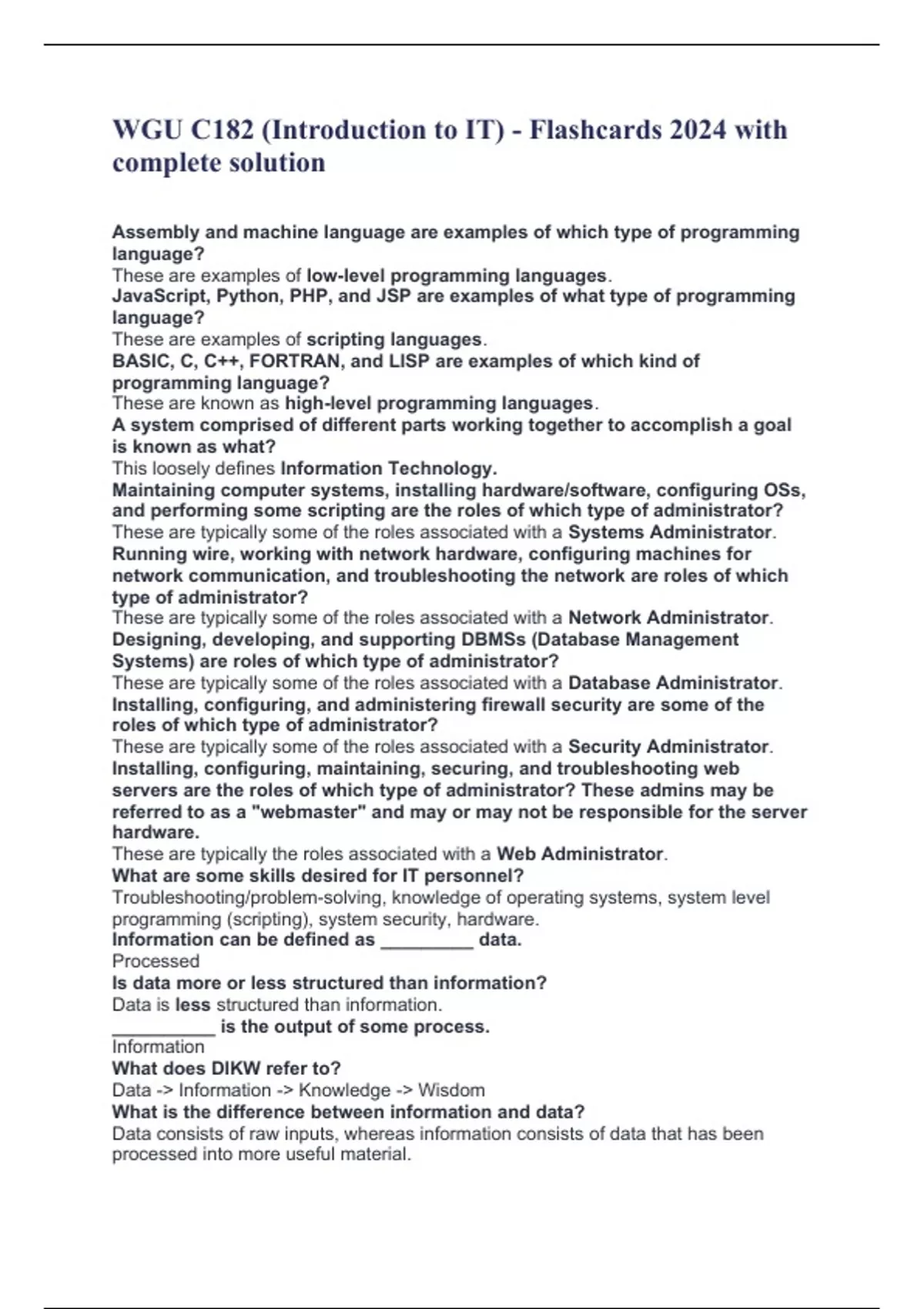 WGU C182 (Introduction to IT) - Flashcards 2024 with complete solution Assembly and machine language are examples of which type of programming language? These are examples of low-level programming languages. JavaScript, Python, PHP, and JSP are examples of what type of programming language? These are examples of scripting languages. BASIC, C, C++, FORTRAN, and LISP are examples of which kind of programming language? These are known as high-level programming languages. A system comprised of different parts working together to accomplish a goal is known as what? This loosely defines Information Technology. Maintaining computer systems, installing hardware/software, configuring OSs, and performing some scripting are the roles of which type of administrator? These are typically some of the roles associated with a Systems Administrator. Running wire, working with network hardware, configuring machines for network communication, and troubleshooting the network are roles of which type of administrator? These are typically some of the roles associated with a Network Administrator. Designing, developing, and supporting DBMSs (Database Management Systems) are roles of which type of administrator? These are typically some of the roles associated with a Database Administrator. Installing, configuring, and administering firewall security are some of the roles of which type of administrator? These are typically some of the roles associated with a Security Administrator. Installing, configuring, maintaining, securing, and troubleshooting web servers are the roles of which type of administrator? These admins may be referred to as a "webmaster" and may or may not be responsible for the server hardware. These are typically the roles associated with a Web Administrator. What are some skills desired for IT personnel? Troubleshooting/problem-solving, knowledge of operating systems, system level programming (scripting), system security, hardware. Information can be defined as _________ data. Processed Is data more or less structured than information? Data is less structured than information. __________ is the output of some process. Information What does DIKW refer to? Data -> Information -> Knowledge -> Wisdom What is the difference between information and data? Data consists of raw inputs, whereas information consists of data that has been processed into more useful material.