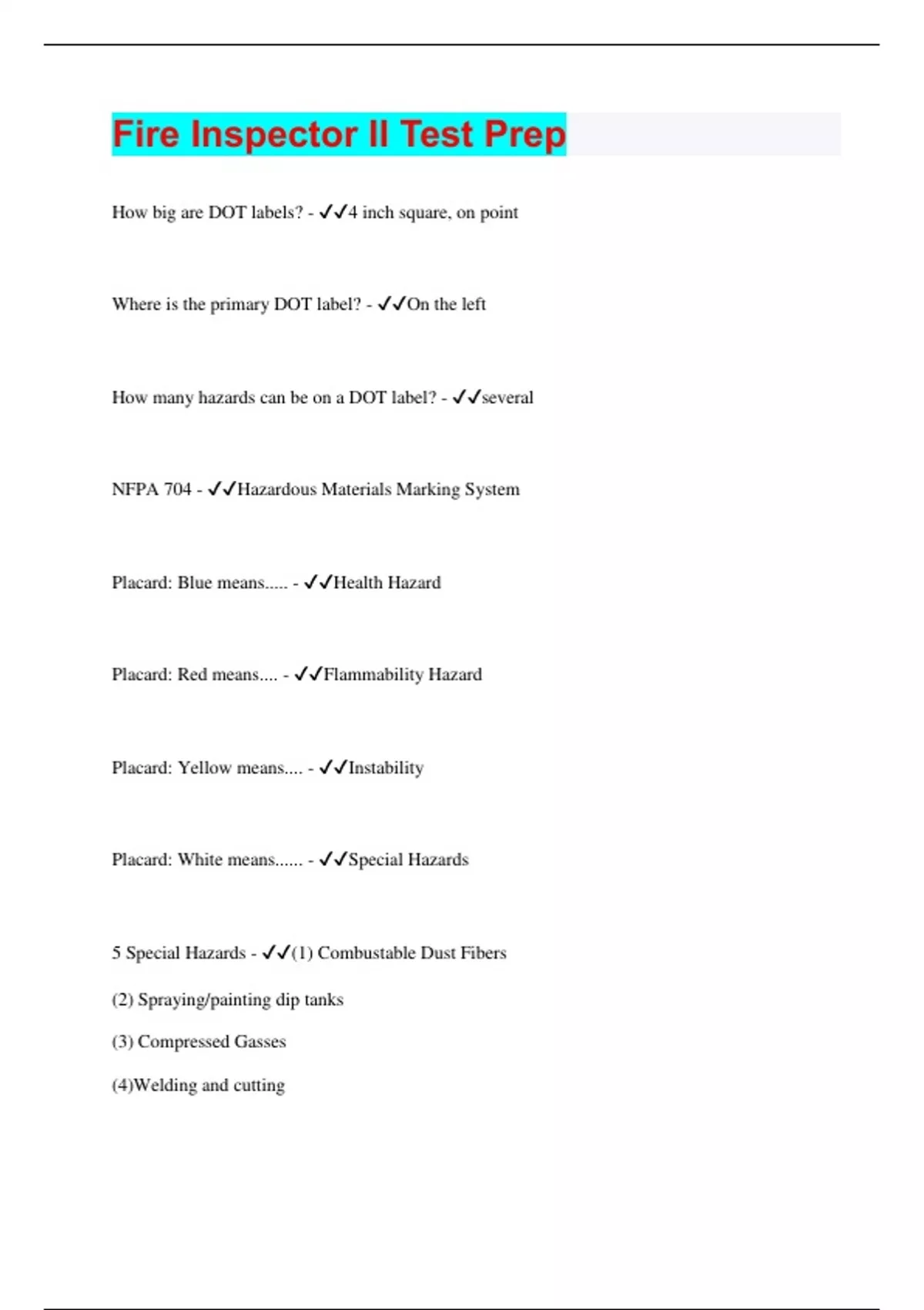 Fire Inspector II Test Prep How big are DOT labels? - 4 inch square, on point Where is the primary DOT label? - On the left How many hazards can be on a DOT label? - several NFPA 704 - Hazardous Materials Marking System Placard: Blue means..... - Health Hazard Placard: Red means.... - Flammability Hazard Placard: Yellow means.... - Instability Placard: White means...... - Special Hazards 5 Special Hazards - (1) Combustable Dust Fibers (2) Spraying/painting dip tanks (3) Compressed Gasses (4)Welding and cutting (5) Hazardous chemicals Article 15 of NFPA 70 - National Electric Code, Divided into 3 classes Class I Locations - Flammable gases and vapors exist under normal conditions Class I Division I Location - Ignitable conditions exist due to repairs or maintenance Class I Division II Location - Ignitable conditions produced or used but confined to closed containers or systems Class II Locations - Hazard is due to combustable dust Class II Division I - Combustable dust is in the air under normal conditions Class II Division II - Combustable dust not normally in quantities to produce explosion or ignitable mixtures Class III Locations - Presence of easily ignitable fibers or flyings which are not likely to produce ignitable mixtures Class III Division I - Fibers or materials producing combustable flyings are handled, manufactured, and used Class III Division II - Fibers are stored or handled other than in the process of manufacture 3 Conditions to meet Class I Location - (1) Combustable present (2) Dangerous mix (3)Sufficient energy to ignite Tracking - Phenomenon where electricity will always find the path of least resistance Warehouse areas for storage of flammable liquids, solids, and hazardous materials and chemicals must not exceed ___________between firewalls - 20,000 square feet Travel distance to nearest exit must not be more than______feet, ______feet if sprinkled - 75, 100 In a warehouse firewalls must have a minimum of _______hour fire rating - 4 Ceiling height in a warehouse must not exceed _______feet - 30 Warehouses must provide a minimum of ______hour fire rating constructions between storage areas - 2 Liquid storage area fire ratings; Less than or equal to 150 square feet = _____hours - 1 Liquid storage area fire ratings; Greater than 150 sqaure feet but less than 500 square feet = _______hours - 2 Fire Resistance Rating of Walls (1) 1 hour = _______ door rating (2) 2 hour =________door rating (3) 4 hour =________door rating - (1) 3/4 (2)1 1/2 (3) 3 Main isles of storage occupancies shall