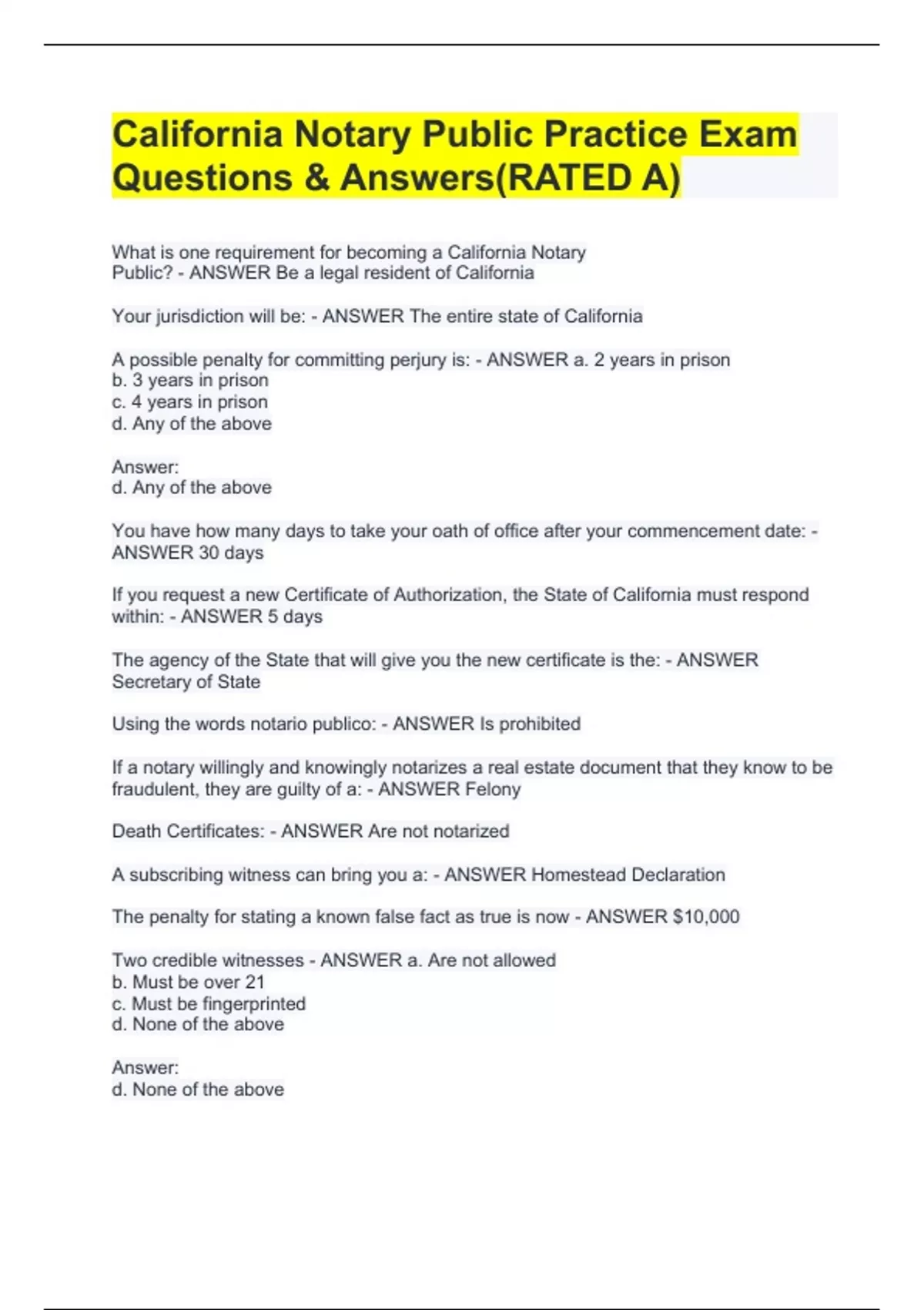 California Notary Public Practice Exam Questions & Answers(RATED A)
