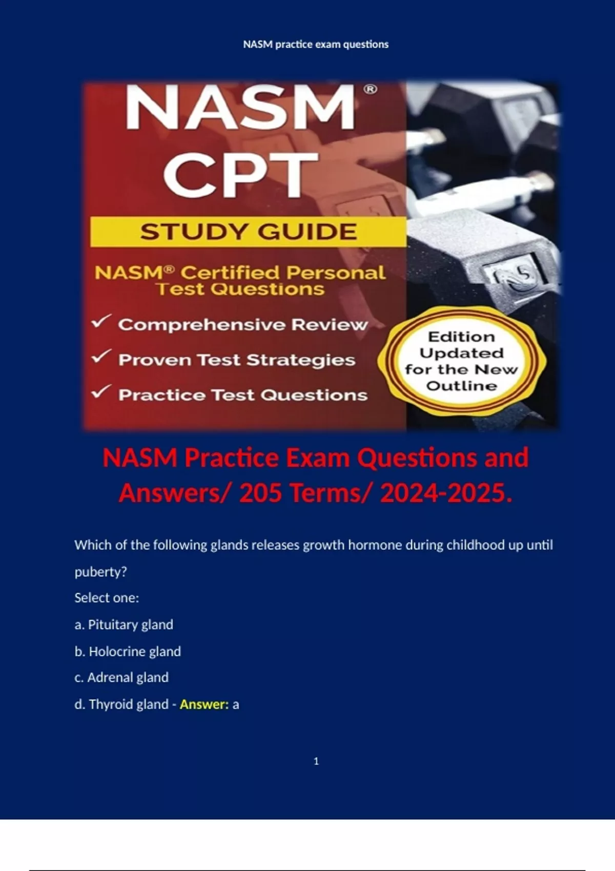 NASM Practice Exam Questions and Answers/ 205 Terms/ . Terms like: Which of the following glands releases growth hormone during childhood up until puberty? Select one: a. Pituitary gland b. Holocrine gland c. Adrenal gland d. Thyroid gland - Answer: a