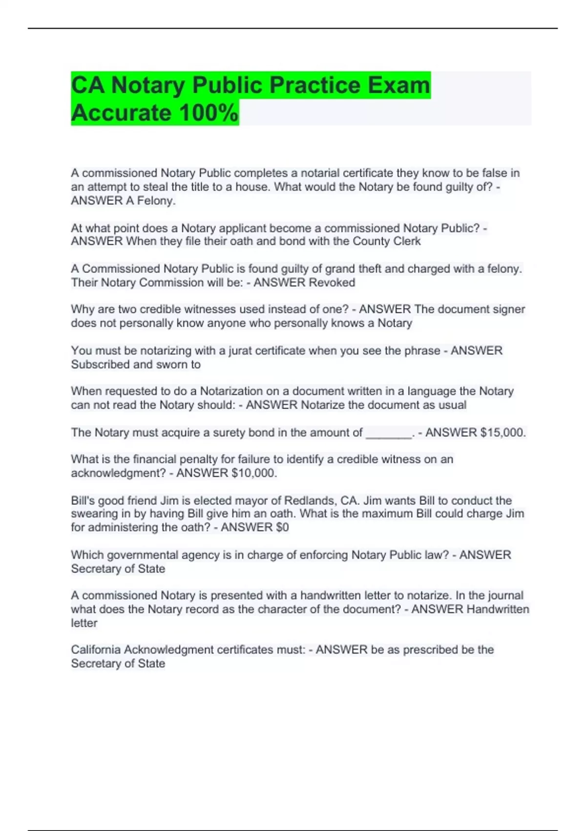 CA Notary Public Practice Exam Accurate 100%