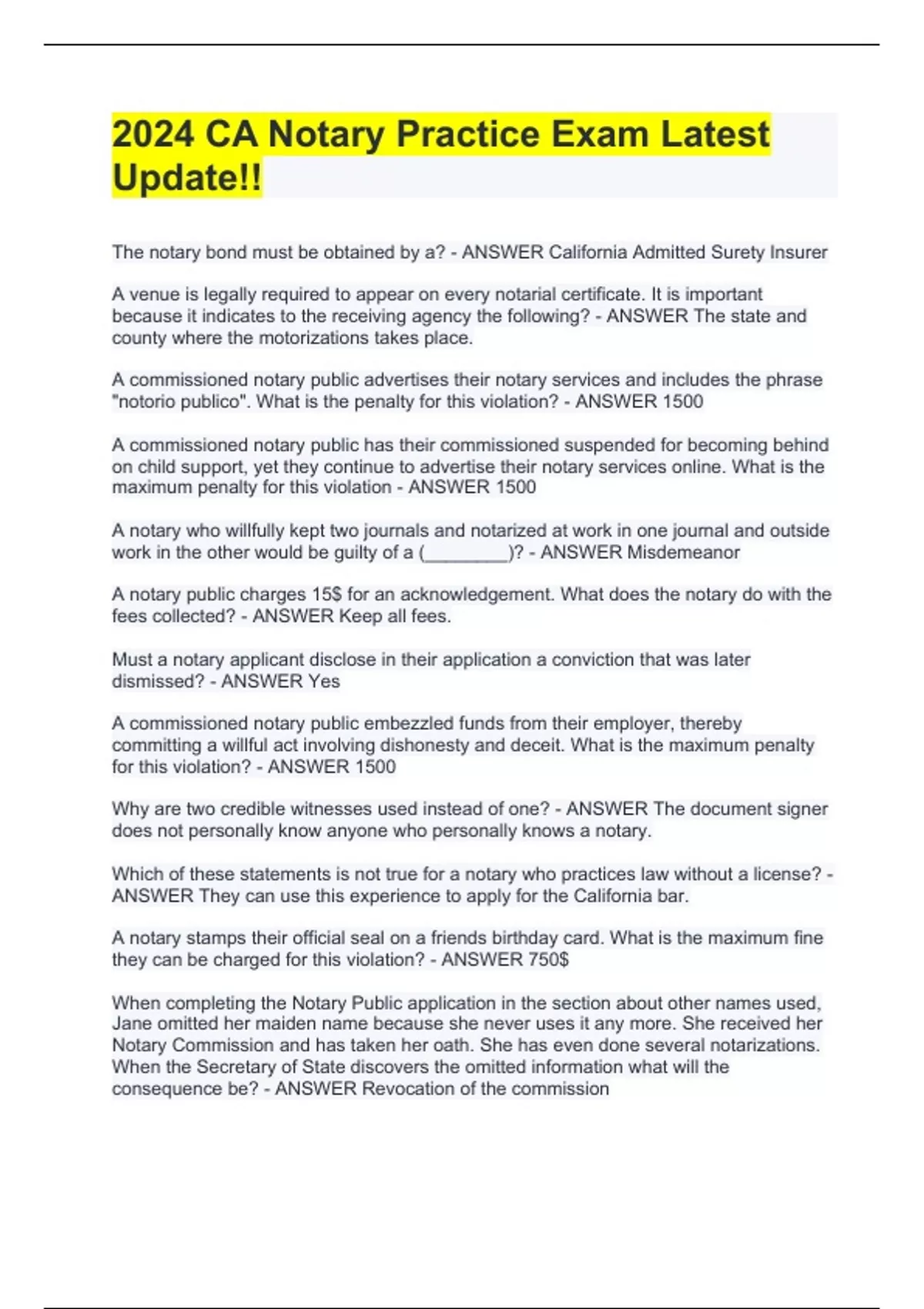 California Notary Public Practice Exam -Multiple Choice Accurate 100%PACKAGE DEAL