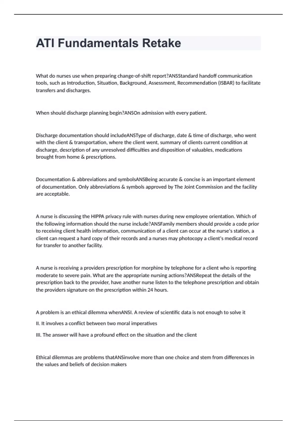 PACKAGE DEAL FOR: ATI FUNDAMENTALS EXAM QUESTIONS AND ANSWERS 2024(GRADED A+) LATEST EDITION