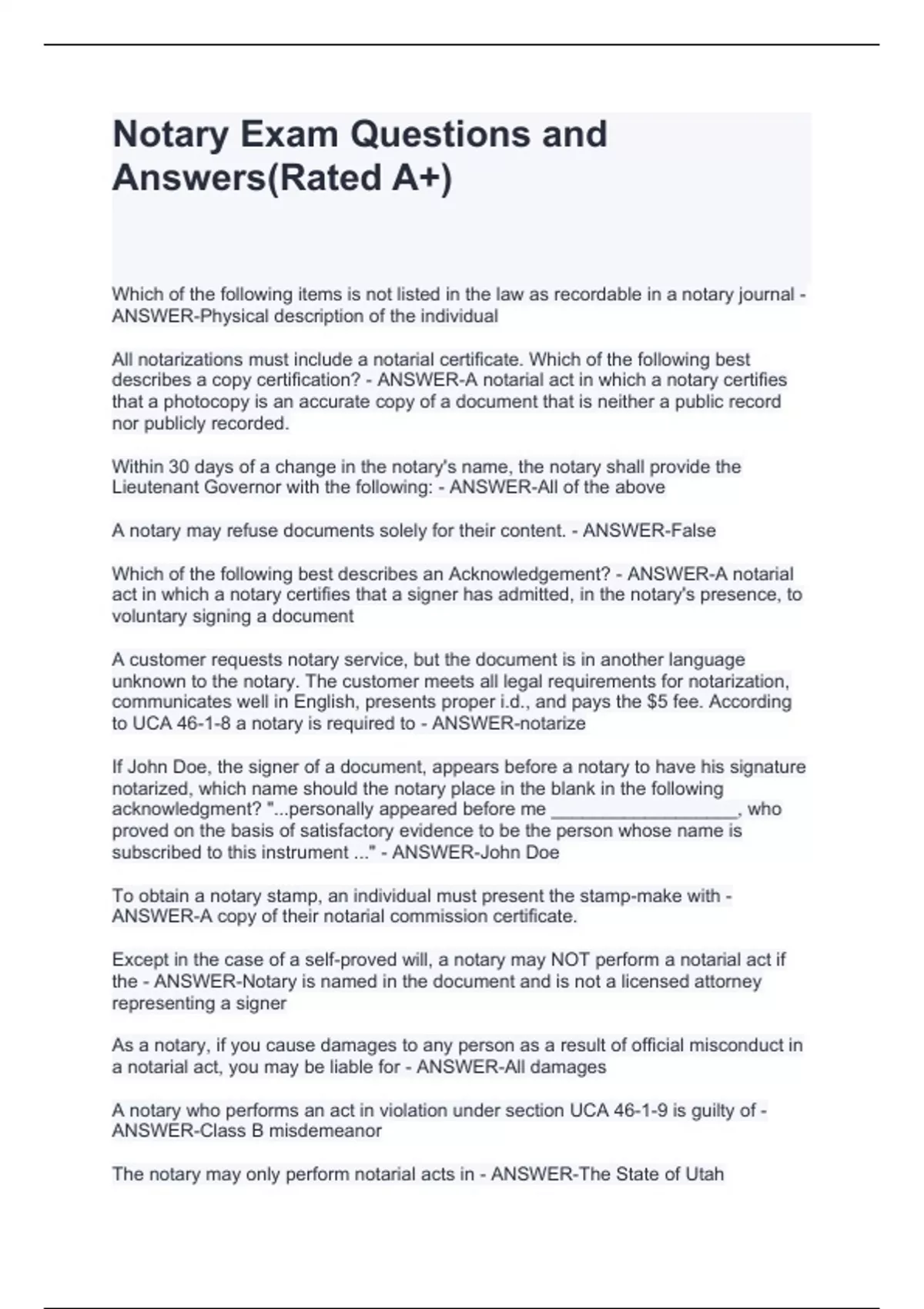All notarizations must include a notarial certificate. Which of the following best describes a copy certification? - ANSWER-A notarial act in which a notary certifies that a photocopy is an accurate copy of a document that is neither a public record nor publicly recorded. Within 30 days of a change in the notary's name, the notary shall provide the Lieutenant Governor with the following: - ANSWER-All of the above A notary may refuse documents solely for their content. - ANSWER-False Which of the following best describes an Acknowledgement? - ANSWER-A notarial act in which a notary certifies that a signer has admitted, in the notary's presence, to voluntary signing a document A customer requests notary service, but the document is in another language unknown to the notary. The customer meets all legal requirements for notarization, communicates well in English, presents proper i.d., and pays the $5 fee. According to UCA 46-1-8 a notary is required to - ANSWER-notarize If John Doe, the signer of a document, appears before a notary to have his signature notarized, which name should the notary place in the blank in the following acknowledgment? "...personally appeared before me __________________, who proved on the basis of satisfactory evidence to be the person whose name is subscribed to this instrument ..." - ANSWER-John Doe To obtain a notary stamp, an individual must present the stamp-make with - ANSWER-A copy of their notarial commission certificate. Except in the case of a self-proved will, a notary may NOT perform a notarial act if the - ANSWER-Notary is named in the document and is not a licensed attorney representing a signer As a notary, if you cause damages to any person as a result of official misconduct in a notarial act, you may be liable for - ANSWER-All damages A notary who performs an act in violation under section UCA 46-1-9 is guilty of - ANSWER-Class B misdemeanor The notary may only perform notarial acts in - ANSWER-The State of Utah