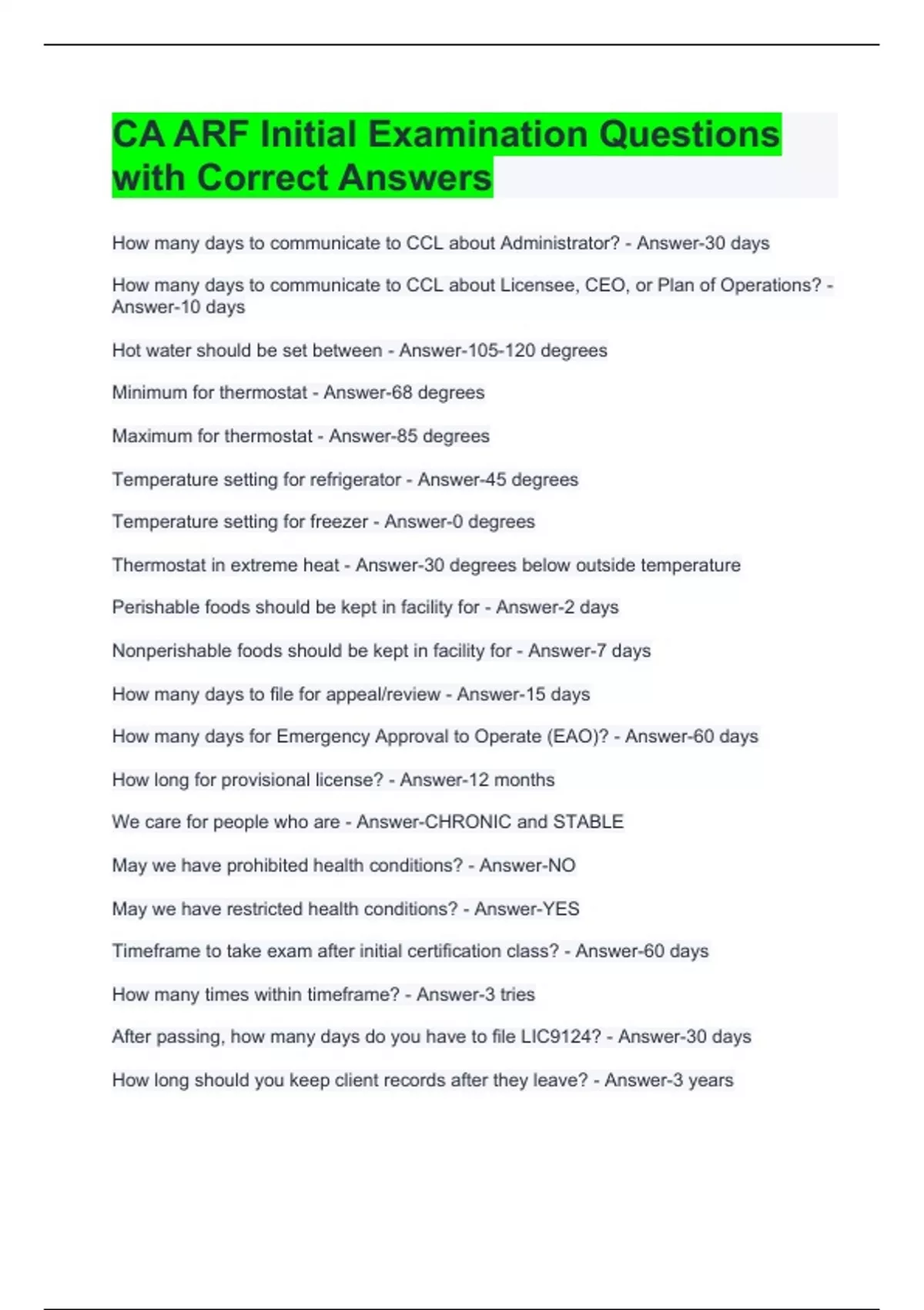 CA ARF Initial Examination Questions with Correct Answers You can give a resident a 30 day eviction notice if rent not paid in... - Answer-10 days Capacity is... - Answer-Maximum number of people authorized to be provided care A mental health disorder is... - Answer-A disorder that meets the criteria of DSM5 Administrators of Adult Residential Facilities must be - Answer-21 and certified When an individual is a licensee and Administrator of an ARF - Answer-Need to comply with administrator and licensee regulations Mandated reporters are - Answer-Administrators, volunteers, direct care workers, maintenance workers For fire clearance on a _____, an automatic sprinkler system is required - Answer-EBSH What should you include in all ads for your facility? - Answer-License number What is included in your licensing application? - Answer-Name, address, fire department When a facility changes location, stock transfers, or increases capacity, it needs... - Answer-a new license application The licensing agency shall have authority to inspect, copy and audit client or facility record - Answer-Upon demand and must be in admissions agreement A room approved for ambulatory clients must be used by - Answer-Ambulatory clients EBSH must receive a certificate of program approval from - Answer-Department of Developmental Services