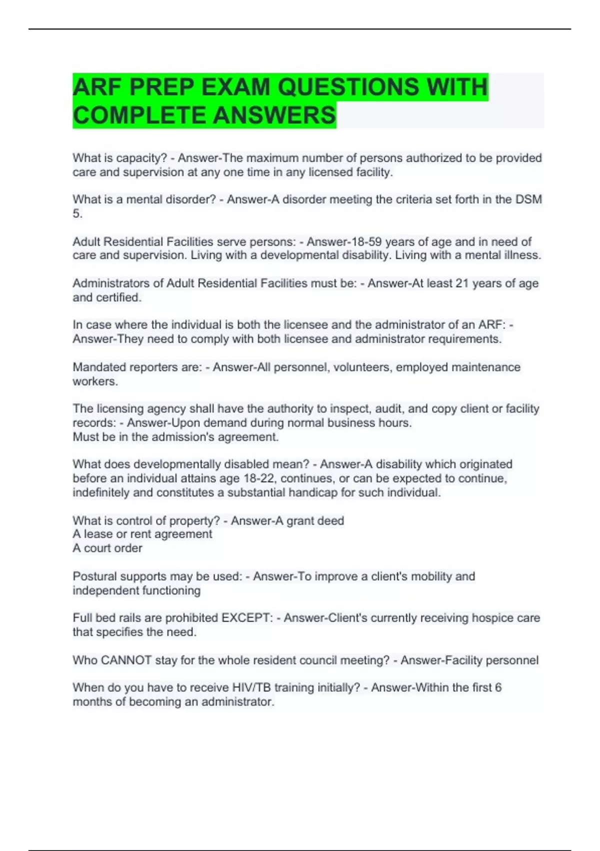 ARF PREP EXAM QUESTIONS WITH COMPLETE ANSWERS Prescription medications which are not taken with the resident upon termination of service shall: - Answer-Be destroyed Who are required to have First Aid? - Answer-All direct care staff are required to complete first aid.