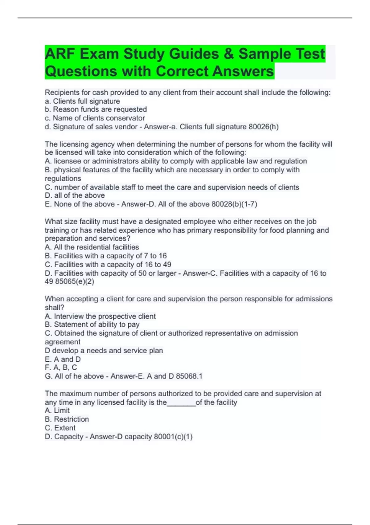 ARF Exam Study Guides & Sample Test Questions with Correct Answers A written report of any vection shall be sent to the licensing agency within____days of the election. A. Three B. Five C. Seven D. Ten - Answer-B. Five 80068(e) A dated employee time schedule shall be developed at least____. A. Weekly B. Monthly C. Each pay period D. Each time a staff person is terminated - Answer-B. Monthly 85066 Employees must be fingerprinted and sign a statement regarding prior criminal convictions _____. A. Within 4 days of hire B. Prior to initial presence in facility C. Within 30 days of hire - Answer-B. Prior to initial presence in facility 80019 A written disaster and mass casualty plan of action must be______. A. The original version submitted with license application B. Kept at the licensees office C. In a safety deposit box or other lockable storage box D. Current and written - Answer-D. Current and written 80023(a)