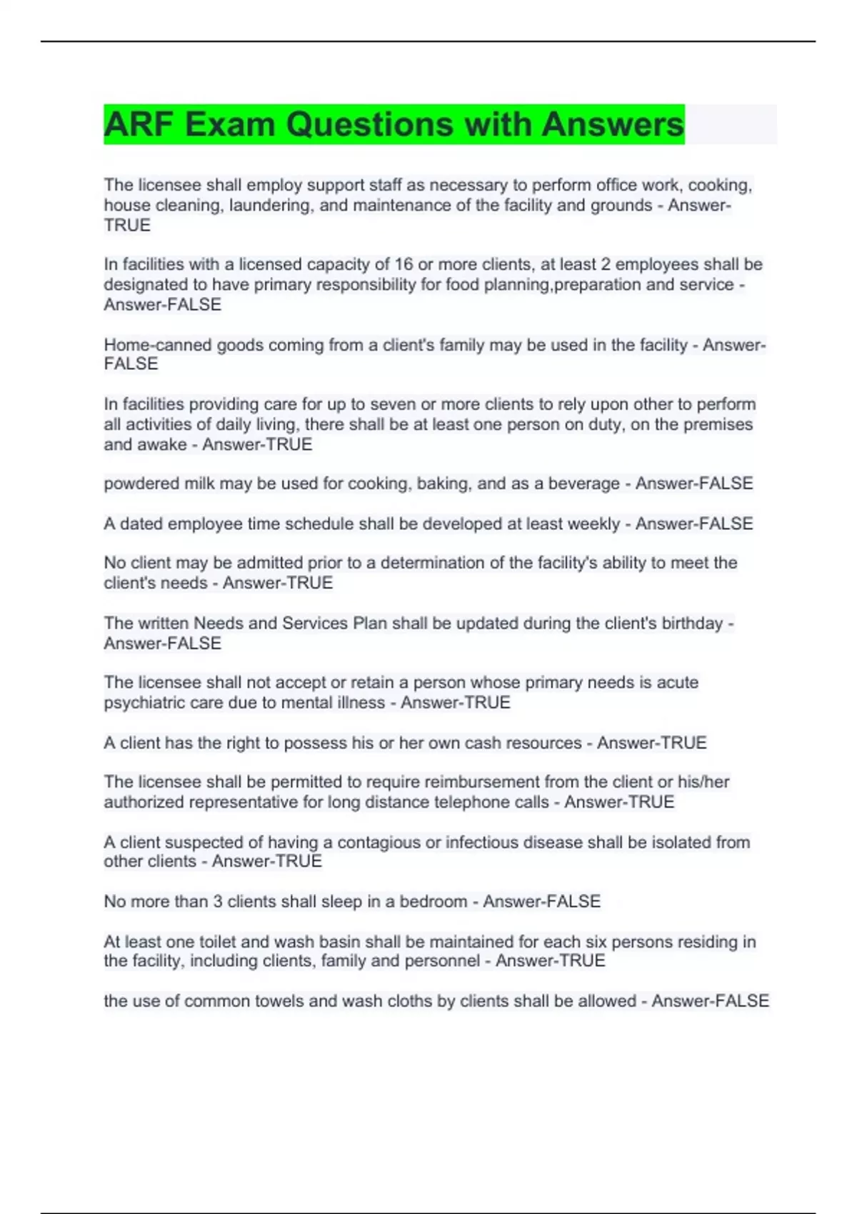 ARF Exam Questions with Answers client's rooms shall be maintained at 70 degrees Fahrenheit - Answer-FALSE A follow-up visit shall be conducted within the next 10 working days following dates of corrections specified in the notice of deficiency - Answer-TRUE Disaster drills shall be conducted in the facility at least every month - Answer-FALSE Emergency approval to operate a temporary approval to operate a license for no more than 30 days - Answer-FALSE protective devices, such as helmets, may be used if they are approved in advance by the licensing agency - Answer-TRUE the licensee shall provide access to the cash resources of clients upon demand by the client of his/her authorized representative - Answer-TRUE within 90 days of receipt of the application by the licensing agency, it shall give written notice to the applicant if the application is complete or deficient - Answer-TRUE the licensing agency shall have the authority to make any number of visits to a facility in order to determine compliance with applicable law and regulation - Answer-TRUE a client's records shall be open to inspection by the client's authorized representative, if any - Answer-TRUE the administrator must be 21 years old to qualify - Answer-TRUE