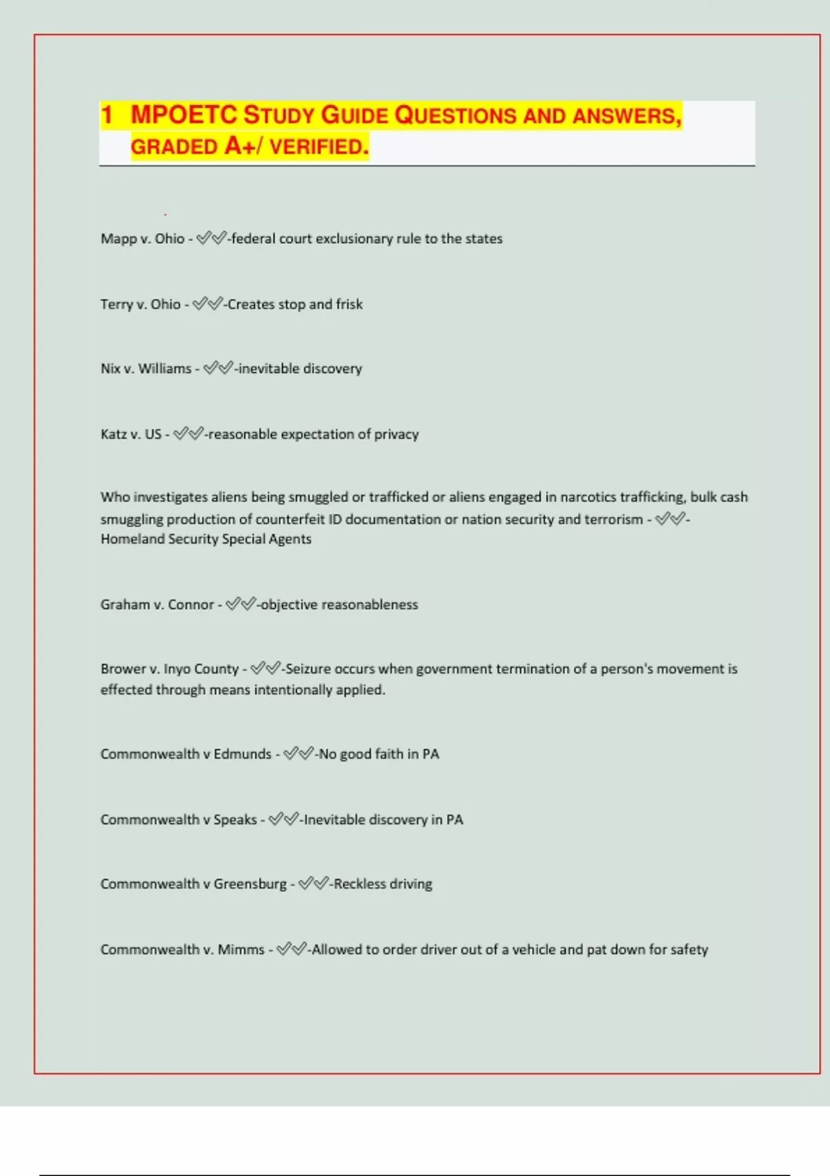 MPOETC STUDY GUIDE QUESTIONS AND ANSWERS, GRADED A+/ VERIFIED. Mapp v. Ohio - -federal court exclusionary rule to the states Terry v. Ohio - -Creates stop and frisk Nix v. Williams - -inevitable discovery Katz v. US - -reasonable expectation of privacy Who investigates aliens being smuggled or trafficked or aliens engaged in narcotics trafficking, bulk cash smuggling production of counterfeit ID documentation or nation security and terrorism - - Homeland Security Special Agents Graham v. Connor - -objective reasonableness Brower v. Inyo County - -Seizure occurs when government termination of a person's movement is effected through means intentionally applied. Commonwealth v Edmunds - -No good faith in PA Commonwealth v Speaks - -Inevitable discovery in PA Commonwealth v Greensburg - -Reckless driving Commonwealth v. Mimms - -Allowed to order driver out of a vehicle and pat down for safety Commonwealth v. Brown - -Order passengers out vehicle Commonwealth v Bunch - -can arrest all people for one thing due to close proximity in car - weed US v. Leon - -good faith exception Commonwealth v Mocoliocco - -Ethnic intimidation/possession of instruments of a crime Georgia v. Randolph - -Without a warrant police have no constitutional right to search a house Miranda v. Arizona - -The accused must be notified of their rights before being questioned by the police Commonwealth v Gary - -Warrentless Searches of a Vehicle 1st Amendment (Article 1 Section 11) - -Freedom of Religion, Speech, Press, Assembly, and Petition 2nd Amendment (Article 1 Section 21) - -R