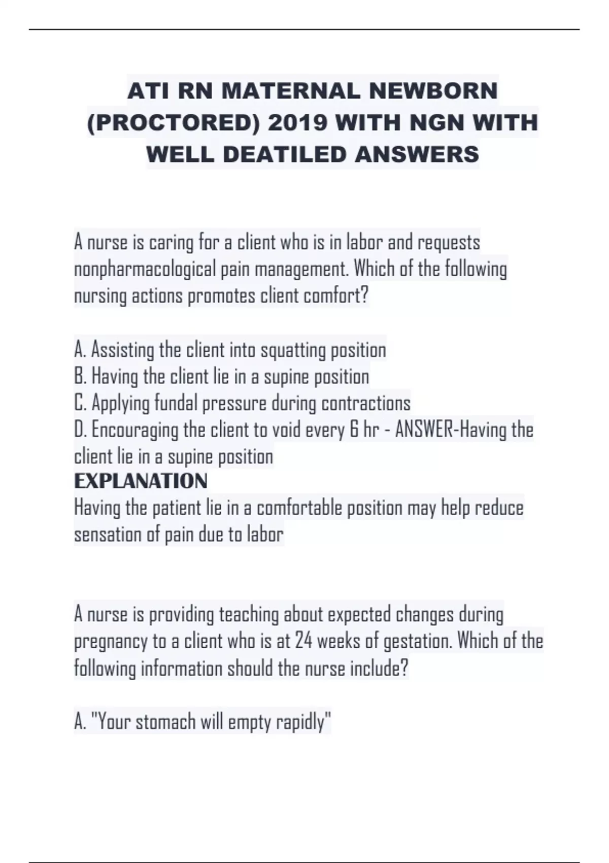 ATI RN MATERNAL NEWBORN (PROCTORED) 2019 WITH NGN WITH WELL DEATILED ANSWERS A nurse is caring for a client who is in labor and requests nonpharmacological pain management. Which of the following nursing actions promotes client comfort? A. Assisting the client into squatting position B. Having the client lie in a supine position C. Applying fundal pressure during contractions D. Encouraging the client to void every 6 hr - ANSWER-Having the client lie in a supine position EXPLANATION Having the patient lie in a comfortable position may help reduce sensation of pain due to labor A nurse is providing teaching about expected changes during pregnancy to a client who is at 24 weeks of gestation. Which of the following information should the nurse include? A. "Your stomach will empty rapidly" B. "You should expect your uterus to double in size" C. "You should anticipate nasal stuffiness." D. "Your nipples will become lighter in color". - ANSWER-You should expect your uterus to double in size" EXPLANATION due to rapid fetal growth due to starting of 3rd trimester A nurse is assessing a newborn following a forceps-assisted birth. Which of the following clinical manifestations should the nurse identify as a complication of the birth method? A. Hypoglycemia B. Polycythemia C. Facial Palsy D. Bronchopulmonary dysplasia - ANSWER-C. Facial Palsy EXPLANATION Most babies delivered by forceps suffer no long-term problems, but in rare cases an injury is sustained to the facial nerve, due to the pressure of the forceps blade on the baby's head. A nurse is caring for newborn immediately following birth and notes a large amount of mucus in the newborn's mouth and nose. Identify the sequence the nurse should follow when performing suction with a bulb syringe. (Move the streps into the box on the placing them in the selected order of performance. Use all the streps.) A. Assess the newborn for reflex bradycardia. B. Compress the bulb syringe C. Place the bulb syringe in the newborn's mouth. D. Use the bulb syringe to suction the newborn's nose. - ANSWER-1. Compress the bulb syringe 2. Place the bulb syringe in the newborn's mouth. 3. Use the bulb syringe to suction the newborn's nose. 4. Assess the newborn for reflex bradycardia. EXPLANATION (this time assessment comes last because if effective bulb suctioning was done, assessment for reflex bradycardia would be negative) A nurse is caring for a client who is in labor and requests nonpharmacological pain management. Which of the following nursing actions promotes client comfort? A. Assisting the client into squatting position B. Having the client lie in a supine position C. Applying fundal pressure during contractions D. Encouraging the client to void every 6 hr - ANSWER-Having the client lie in a supine position EXPLANATION Having the patient lie in a comfortable position may help reduce sensation of pain due to labor A nurse is providing teaching about expected changes during pregnancy to a client who is at 24 weeks of gestation. Which of the following information should the nurse include? A. "Your stomach will empty rapidly" B. "You should expect your uterus to double in size" C. "You should anticipate nasal stuffiness." D. "Your nipples will become lighter in color". - ANSWER-You should expect your uterus to double in size" EXPLANATION due to rapid fetal growth due to starting of 3rd trimester A nurse is assessing a newborn following a forceps-assisted birth. Which of the following clinical manifestations should the nurse identify as a complication of the birth method? A. Hypoglycemia B. Polycythemia C. Facial Palsy D. Bronchopulmonary dysplasia - ANSWER-C. Facial Palsy EXPLANATION Most babies delivered by forceps suffer no long-term problems, but in rare cases an injury is sustained to the facial nerve, due to the pressure of the forceps blade on the baby's head. A nurse is caring for newborn immediately following birth and notes a large amount of mucus in the newborn's mouth and nose. Identify the sequence the nurse should follow when performing suction with a bulb syringe. (Move the streps into the box on the placing them in the selected order of performance. Use all the streps.) A. Assess the newborn for reflex bradycardia. B. Compress the bulb syringe C. Place the bulb syringe in the newborn's mouth. D. Use the bulb syringe to suction the newborn's nose. - ANSWER-1. Compress the bulb syringe 2. Place the bulb syringe in the newborn's mouth. 3. Use the bulb syringe to suction the newborn's nose. 4. Assess the newborn for reflex bradycardia. EXPLANATION (this time assessment comes last because if effective bulb suctioning was done, assessment for reflex bradycardia would be negative)