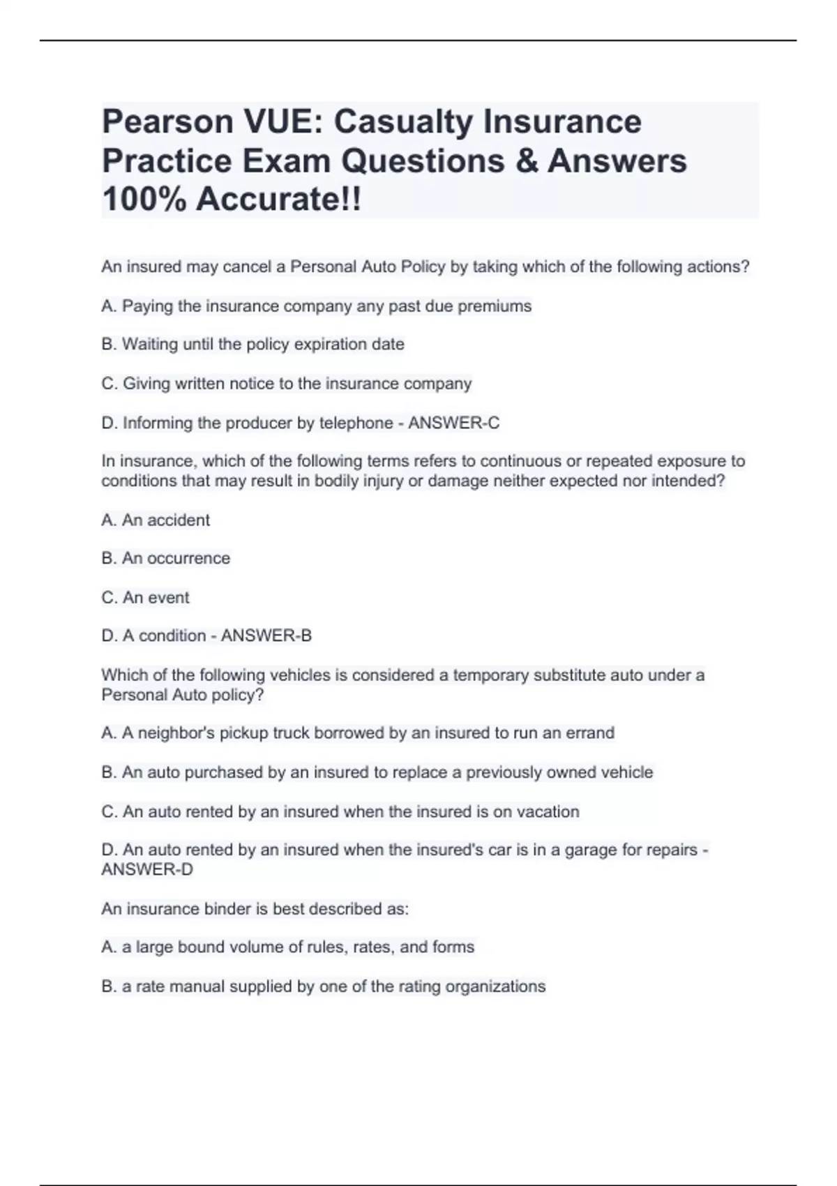 An insured may cancel a Personal Auto Policy by taking which of the following actions? A. Paying the insurance company any past due premiums B. Waiting until the policy expiration date C. Giving written notice to the insurance company D. Informing the producer by telephone - ANSWER-C In insurance, which of the following terms refers to continuous or repeated exposure to conditions that may result in bodily injury or damage neither expected nor intended? A. An accident B. An occurrence C. An event D. A condition - ANSWER-B Which of the following vehicles is considered a temporary substitute auto under a Personal Auto policy? A. A neighbor's pickup truck borrowed by an insured to run an errand B. An auto purchased by an insured to replace a previously owned vehicle C. An auto rented by an insured when the insured is on vacation D. An auto rented by an insured when the insured's car is in a garage for repairs - ANSWER-D An insurance binder is best described as: A. a large bound volume of rules, rates, and forms B. a rate manual supplied by one of the rating organizations C. a temporary agreement to pay a claim pending final settlement D. temporary short-term evidence of coverage - ANSWER-D Anything that increases the chance of loss is known as a(n): A. risk B. hazard C. direct loss D. indirect loss - ANSWER-B The Fair Credit Reporting