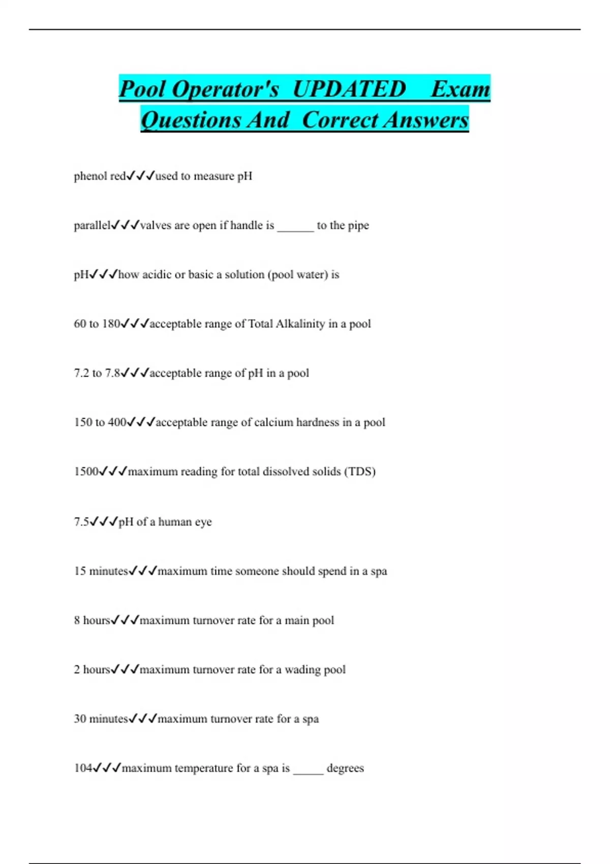 Pool Operator's UPDATED Exam Questions And Correct Answers