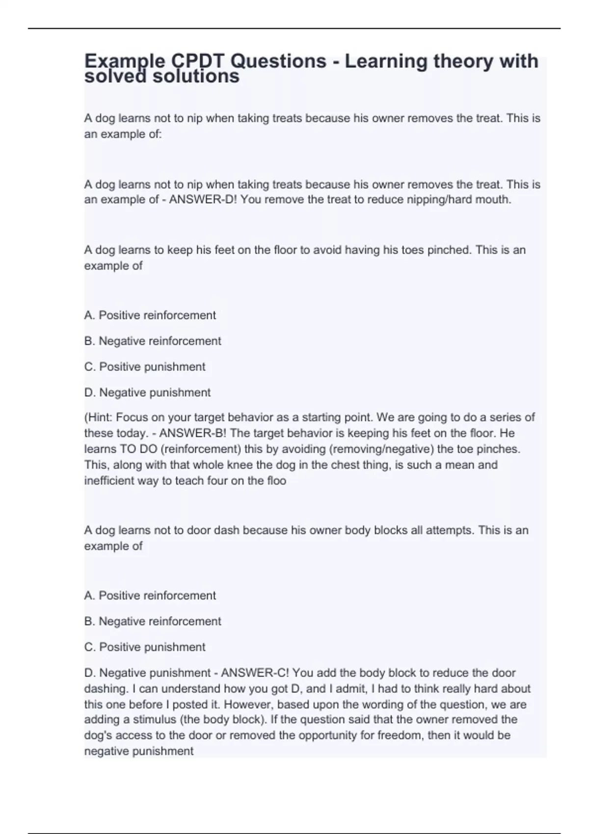 A dog learns not to nip when taking treats because his owner removes the treat. This is an example of: A dog learns not to nip when taking treats because his owner removes the treat. This is an example of - ANSWER-D! You remove the treat to reduce nipping/hard mouth. A dog learns to keep his feet on the floor to avoid having his toes pinched. This is an example of A. Positive reinforcement B. Negative reinforcement C. Positive punishment D. Negative punishment (Hint: Focus on your target behavior as a starting point. We are going to do a series of these today. - ANSWER-B! The target behavior is keeping his feet on the floor. He learns TO DO (reinforcement) this by avoiding (removing/negative) the toe pinches. This, along with that whole knee the dog in the chest thing, is such a mean and inefficient way to teach four on the floo A dog learns not to door dash because his owner body blocks all attempts. This is an example of A. Positive reinforcement B. Negative reinforcement C. Positive punishment D. Negative punishment - ANSWER-C! You add the body block to reduce the door dashing. I can understand how you got D, and I admit, I had to think really hard about this one before I posted it. However, based upon the wording of the question, we are adding a stimulus (the body block). If the question said that the owner removed the