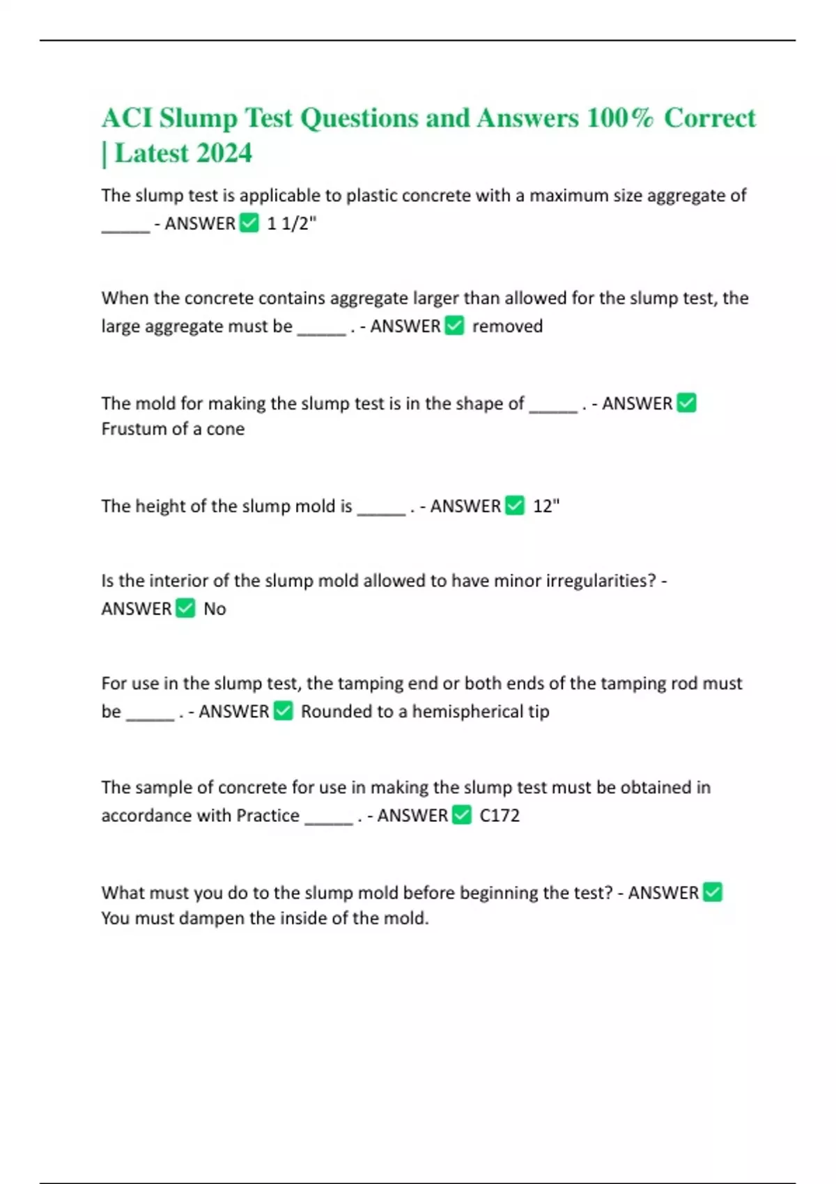 ACI Slump Test Questions and Answers 100% Correct | Latest 2024