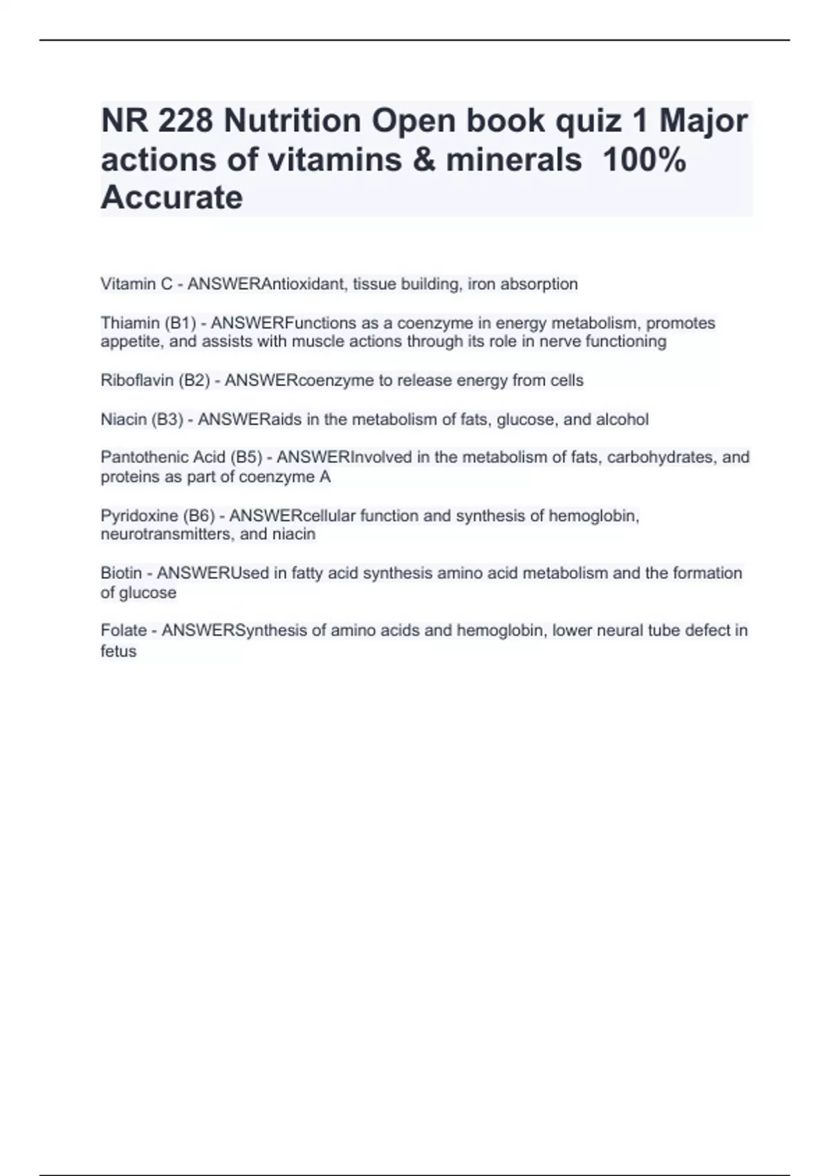 NR 228 Nutrition Open book quiz 1 Major actions of vitamins & minerals 100% Accurate