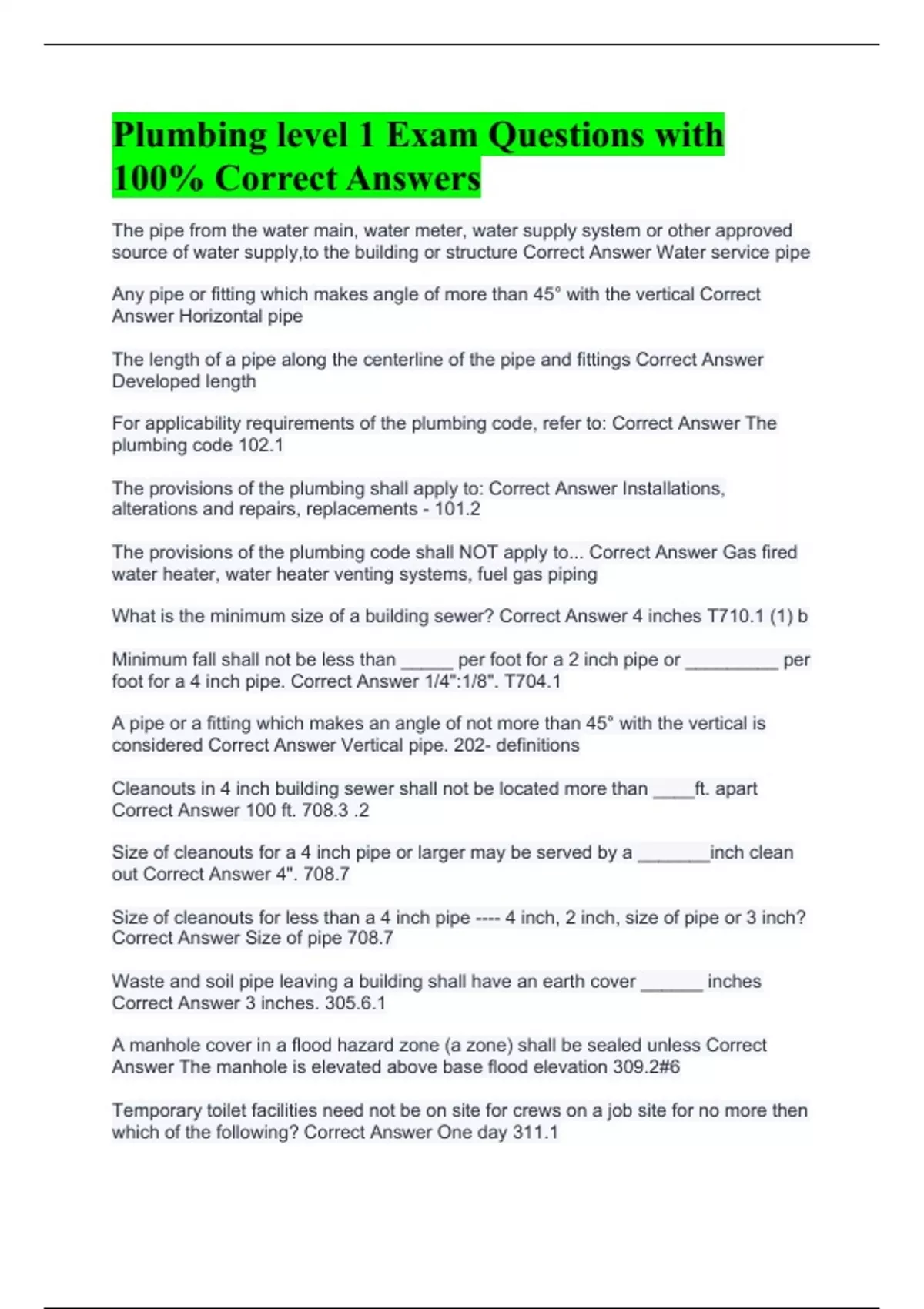 Plumbing level 1 Exam Questions with 100% Correct Answers