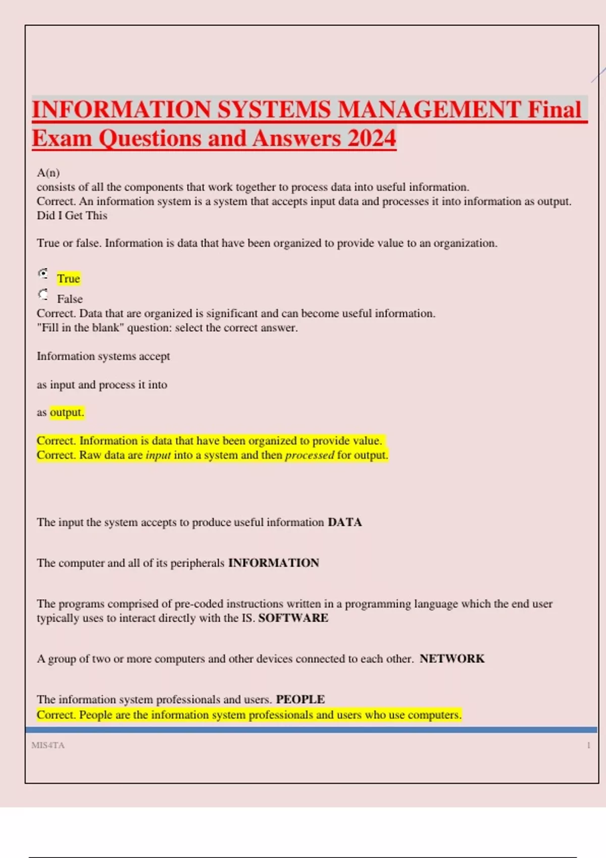 INFORMATION SYSTEMS MANAGEMENT Final Exam Questions and Answers 2024