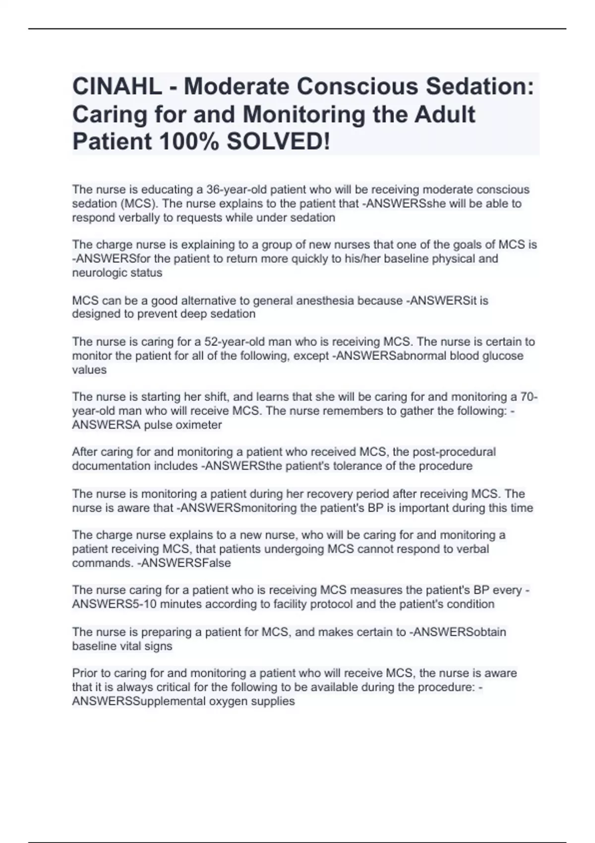 CINAHL - Moderate Conscious Sedation: Caring for and Monitoring the Adult Patient 100% SOLVED!